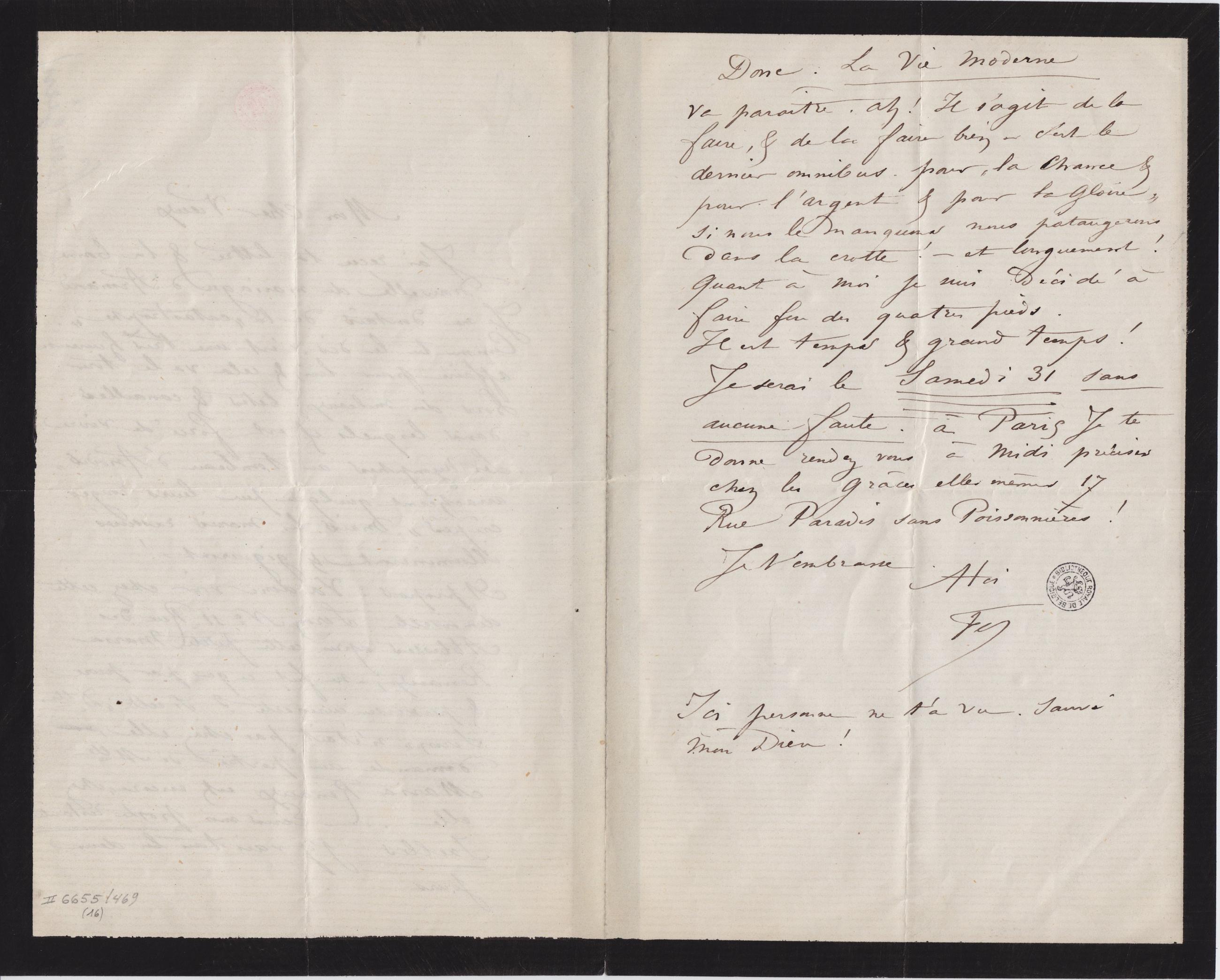va paraître. Ah ! Il s’agit de la faire, & de la faire bien – c’est le dernier omnibus. pour « la Chance & pour l’Argent & pour la Gloire » si nous le manquons nous pataugerons dans la crotte ! – et longuement ! Quant à moi je suis décidé à faire feu des quatre pieds.