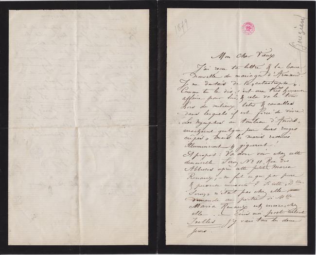 À propos : Va donc voir chez cette demoiselle SirinN° 11 Rue des Abbesses après cette petite Maria Renaux, – ne fut ce que par pure & perverse curiosité ? Si cette « Dlle Sirin » n’était pas chez elle, demande au portier si MlleMaria Renaux est encore « chez elle. – Écris moi poste restante Ixelles j’y vais tous les deux jours.
