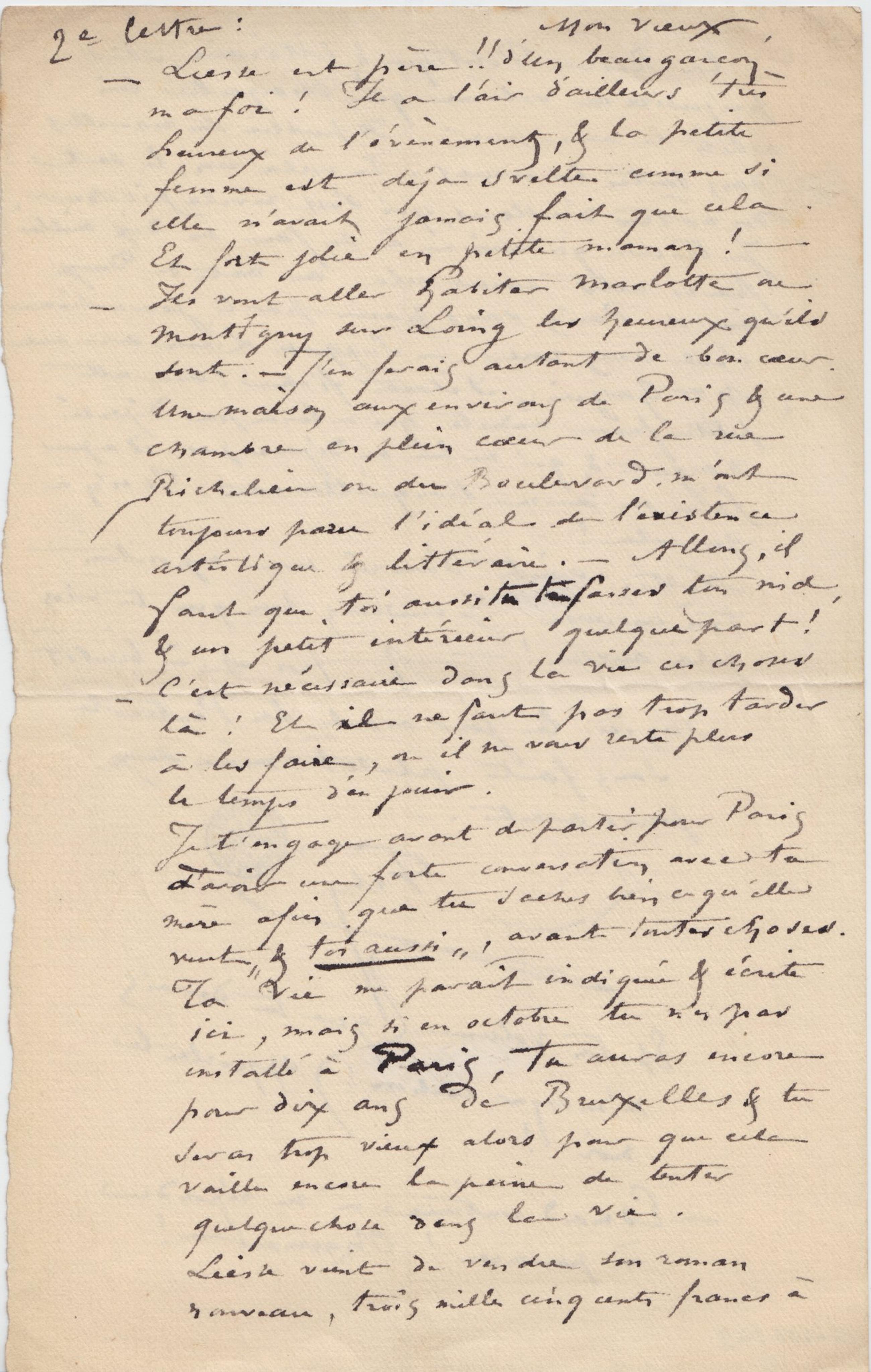 Je t’engage avant de partir pour Paris à avoir une forte conversation avec ta mère afin que tu saches bien ce qu’elle veut « & toi aussi », avant toutes choses. Ta vie me paraît indiquée & écrite ici, mais si en octobre tu n’es pas installé à Paris, tu auras encore pour dix ans de Bruxelles & tu seras trop vieux alors pour que cela vaille encore la peine de tenter quelque chose dans la vie.