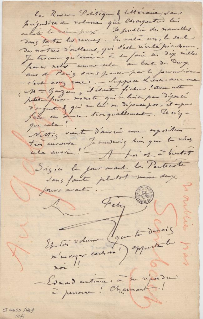 la Revue Politique & littéraire, sans préjudice du volume que Charpentier lui achète le même prix. Il publie des nouvelles dans toutes les revues. En voilà un, le seul des nôtres d’ailleurs, qui s’est révelé piocheur. Je trouve qu’arriver à se faire ses dix mille francs nets comme cela au bout de deux ans de Paris sans passer par le journalisme c’est assez rare. – Suppose Liesse avec une « Mme Gouzien » il était fichu ! Avec cette petite femme modeste qui ne lui a pas dépensé d’argent & qui ne lui en dépense pas, il a pu faire une œuvre tranquillement. Il n’y a que cela !