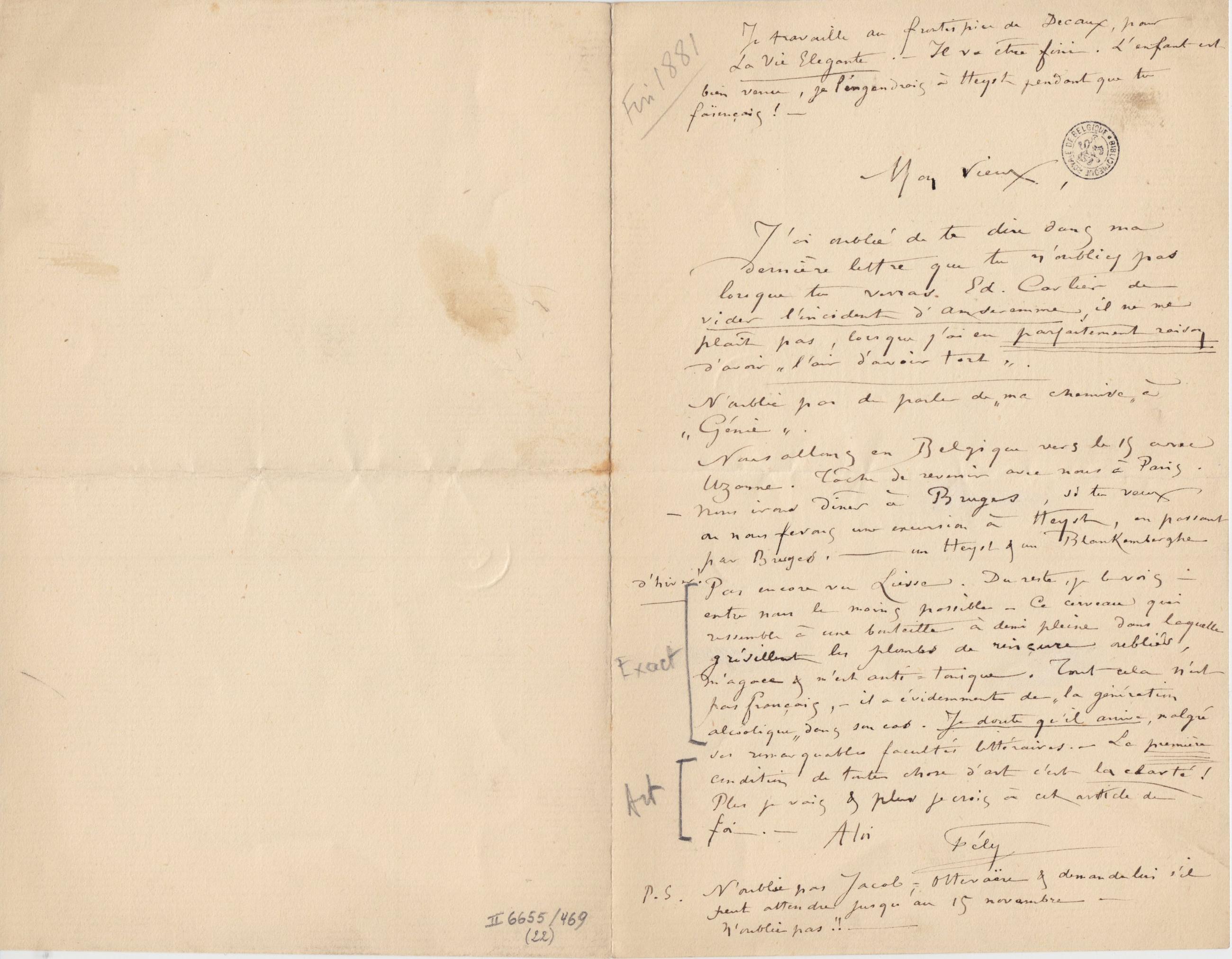 J’ai oublié de te dire dans ma dernière lettre que tu n’oublies pas lorsque tu verras Ed. Carlier de vider l’incident d’Anseremme, il ne me plaît pas, lorsque j’ai eu parfaitement raison d’avoir « l’air d’avoir tort ».