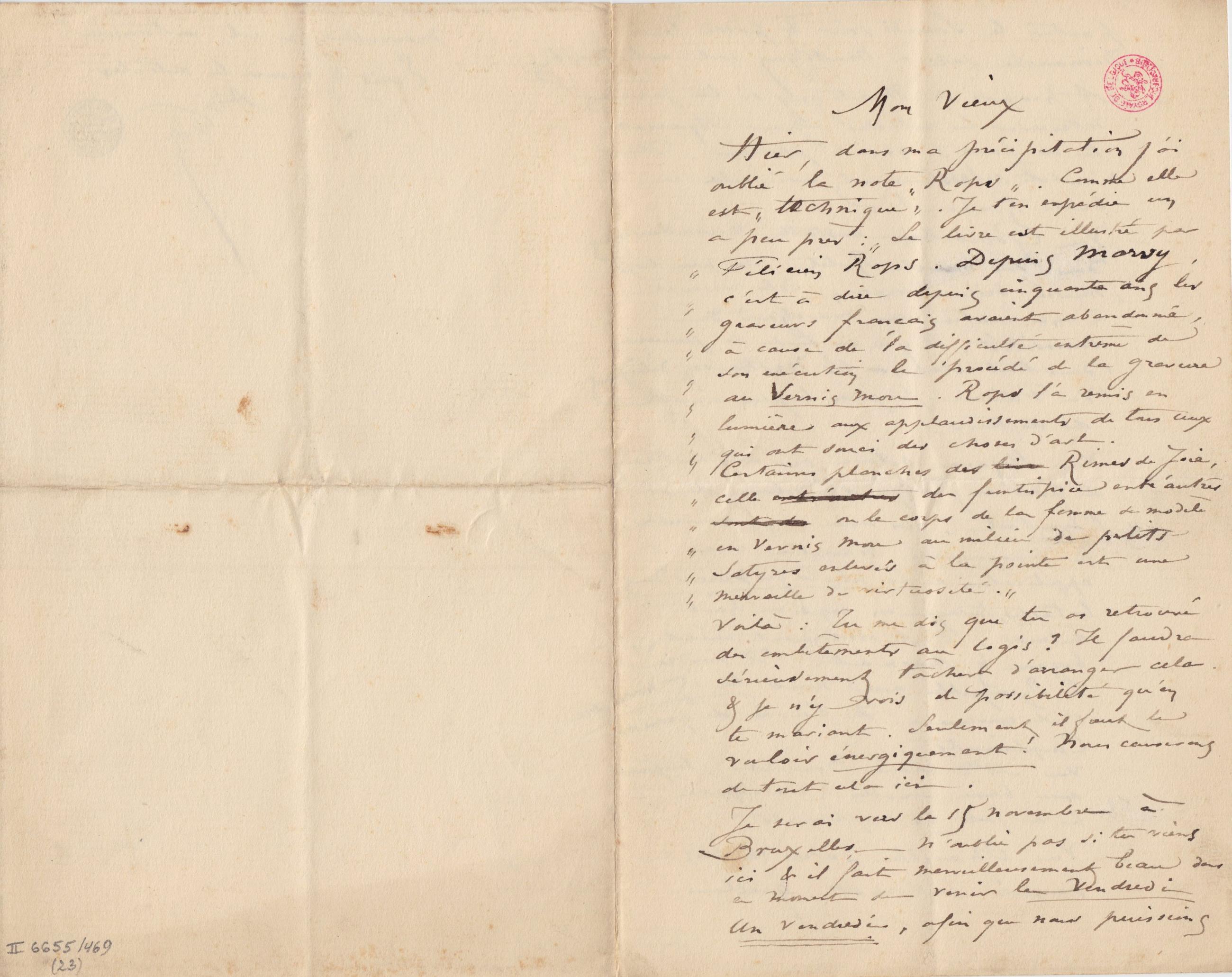 Hier, dans ma précipitation j’ai oublié la note « Rops ». Comme elle est « technique ». Je t’en expédie un à peu près : « Le livre est illustré par Félicien Rops. Depuis Marvy, c’est à dire depuis cinquante ans les graveurs français avaient abandonné, à cause de la difficulté extrême de son exécution le procédé de la gravure au Vernis mou. Rops l’a remis en lumière aux applaudissements de tous ceux qui ont souci des choses d’art.