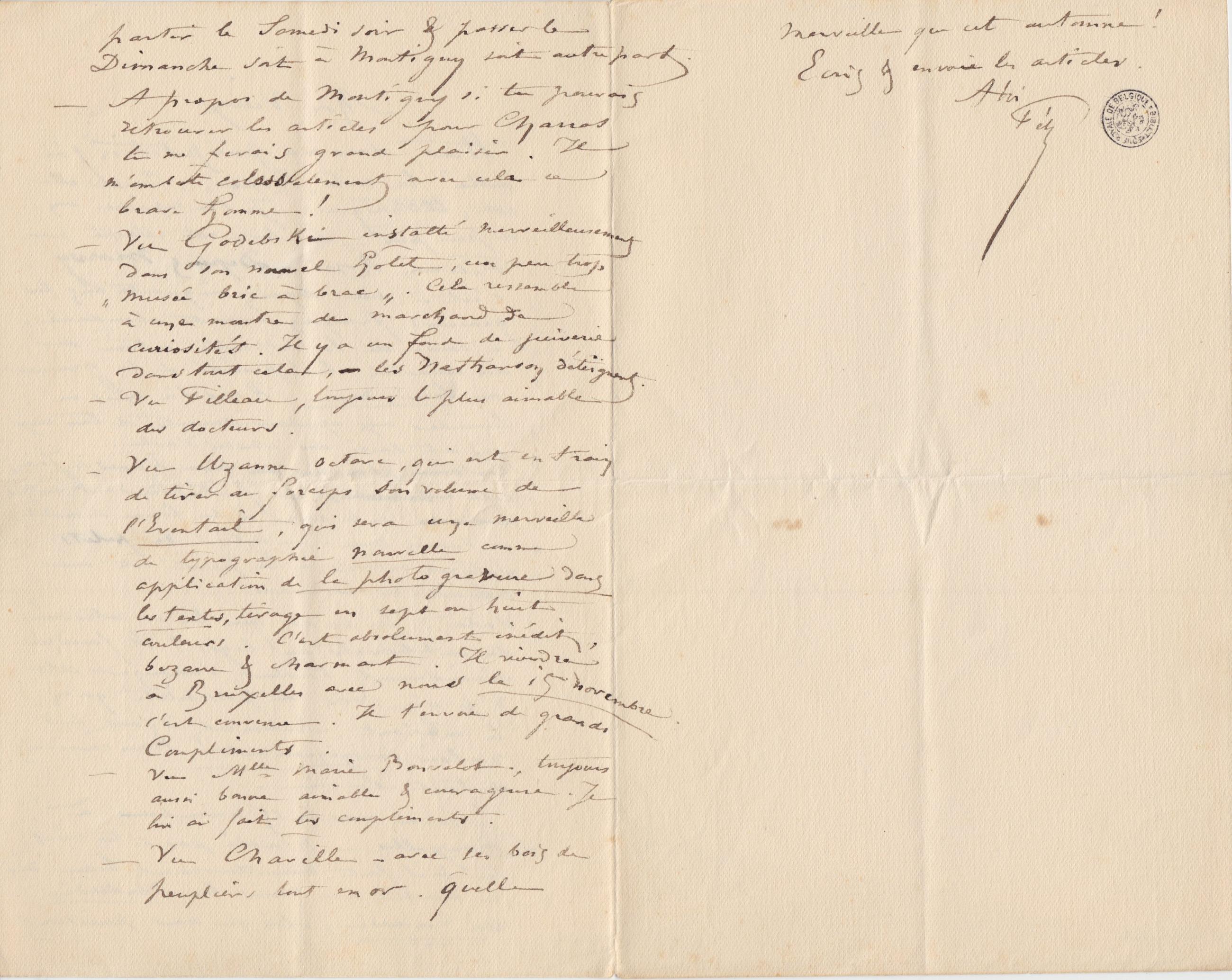 – Vu Uzanne Octave, qui est en train de tirer au forceps son volume de l’Éventail, qui sera une merveille de typographie nouvelle comme application de la photogravure dans les textes, tirage en sept ou huit couleurs. C’est absolument inédit, bizarre & charmant. Il viendra à Bruxelles avec nous le 15 novembre. C’est convenu. Je t’envoie de grands Compliments.