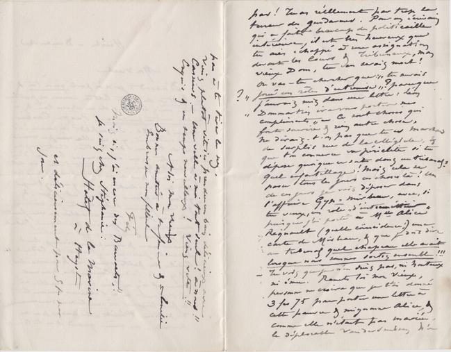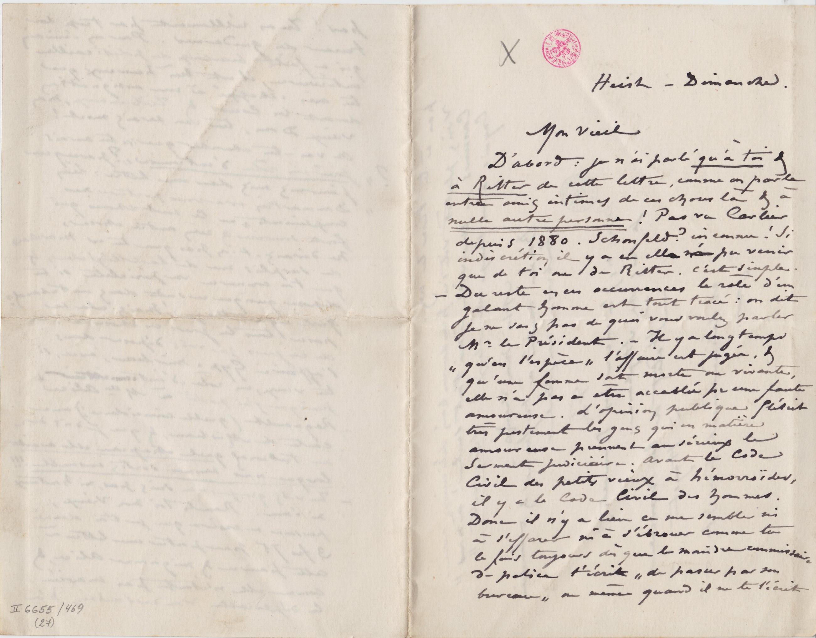 D’abord : je n’ai parlé qu’à toi & à Ritter de cette lettre, comme on parle entre amis intimes de ces choses là & à nulle autre personne ! Pas vu Carlier depuis 1880. Schonfeld ? inconnu ! Si indiscrétion il y a eu elle n’a pu venir que de toi ou de Ritter. C’est simple.