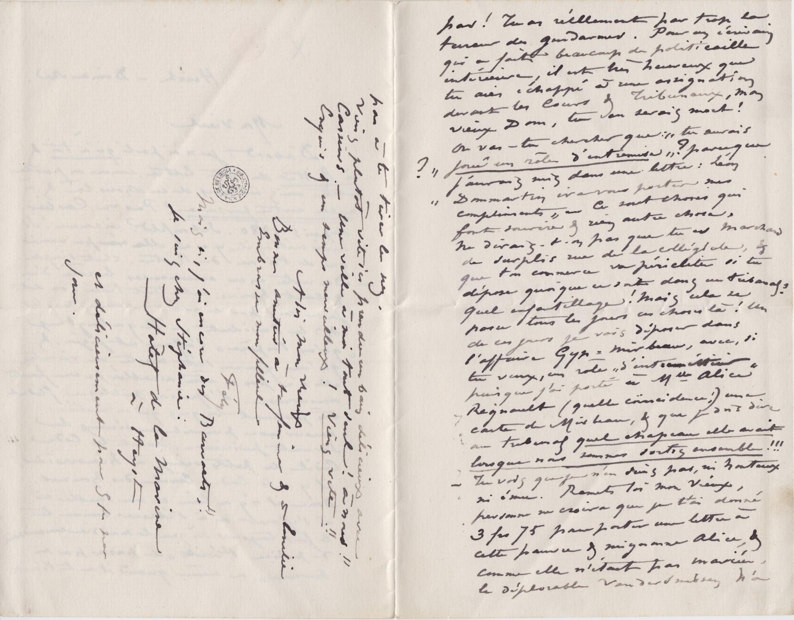– Tu vois que je n’en suis pas, ni honteux ni ému. Remets toi Mon Vieux, personne ne croira que je t’ai donné 3 frs 75 pour porter une lettre à cette pauvre & mignonne Alice, & comme elle n’était pas mariée, le déplorable Vandersmebsen n’a