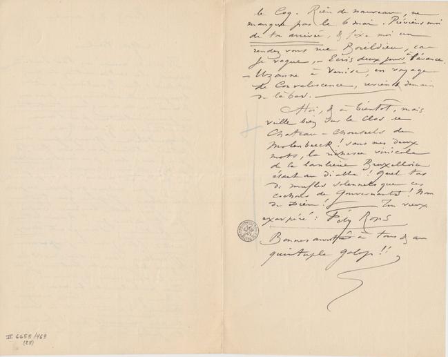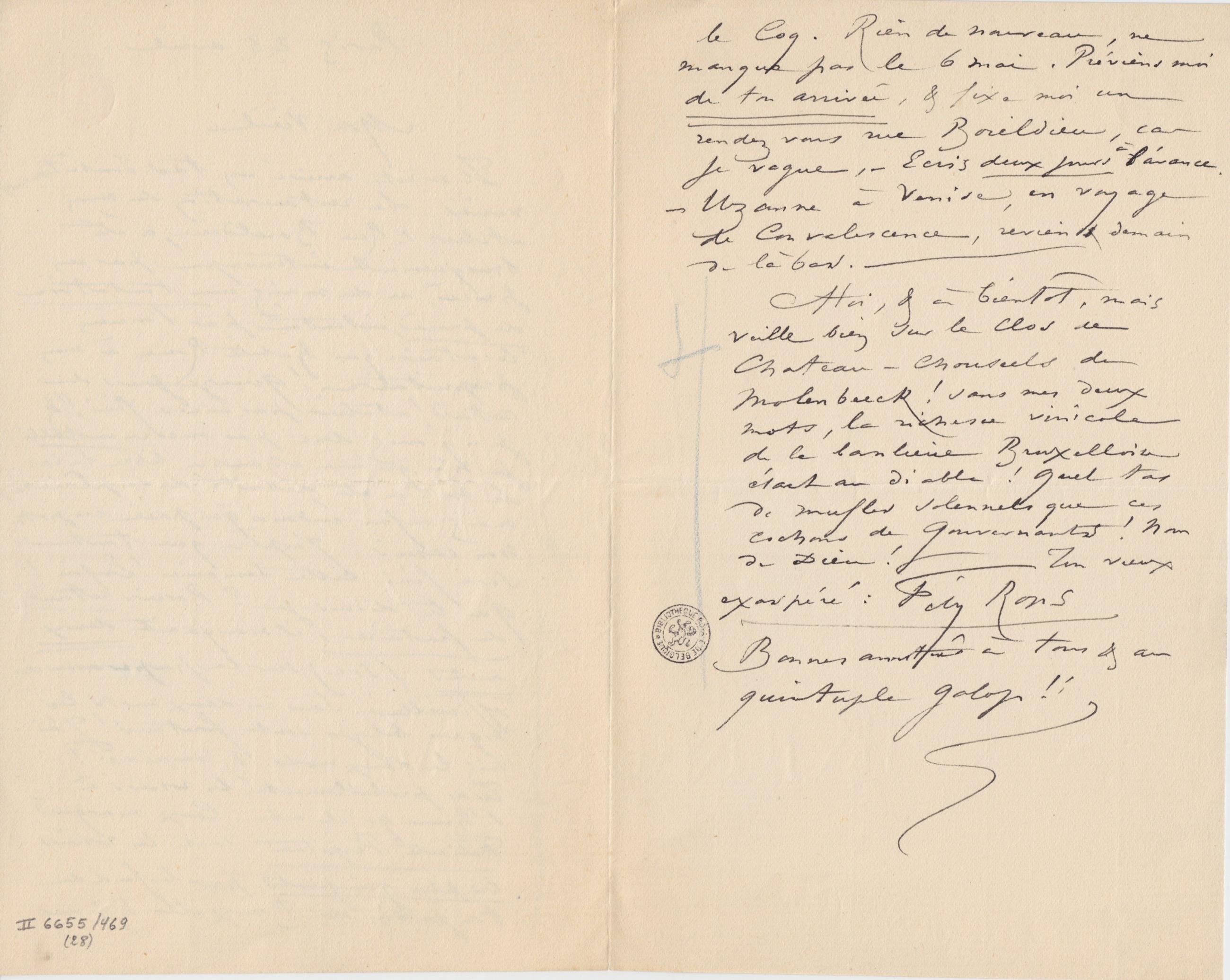 À toi, & à bientôt, mais veille bien sur le clos de Chateau – chauseels de Molenbeeck ! sans mes deux mots, la richesse vinicole de la banlieue Bruxelloise était au diable ! Quel tas de mufles solennels que ces cochons de gouvernants ! Nom de Dieu !