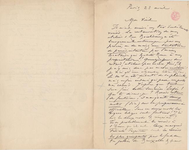 Il m’est arrivé un tas d’embêtements variés. La restauration de mon atelier 1. Rue Boieldieu, a été brusquement interrompu par un procès, ou du moins une tentative de procès, intentée par l’ancien locataire qui habite Rome à mon propriétaire ! Quinze jours de retard ! atelier pas encore fini !! & je n’y suis donc pas encore installé : je n’ai qu’une chambre libre là bas. Le Mr a été débouté de sa plainte, mais enfin c’est moi qui paie ces pots non cassés. J’espère que tout sera fini cette semaine ! Enfin !