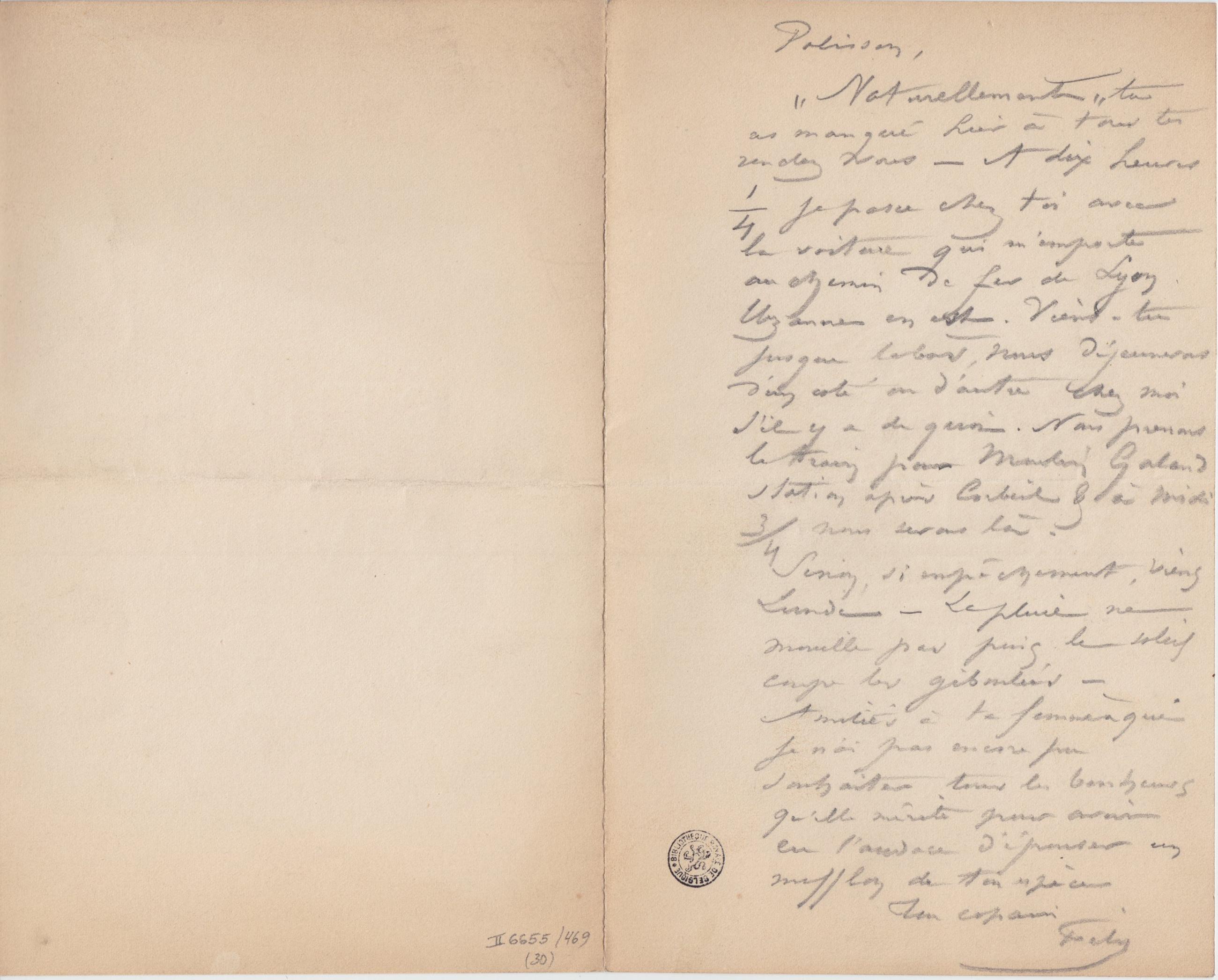 « Naturellement » tu as manqué hier à tous tes rendez vous – À dix heures ¼ je passe chez toi avec la voiture qui m’emporte au chemin de fer de Lyon. Uzanne en est. Viens-tu jusque labàs, nous déjeunerons d’un coté ou d’autre chez moi s’il y a de quoi. Nous prenons le train pour Moulin Galant station après Corbeil & à midi ¾ nous serons là.