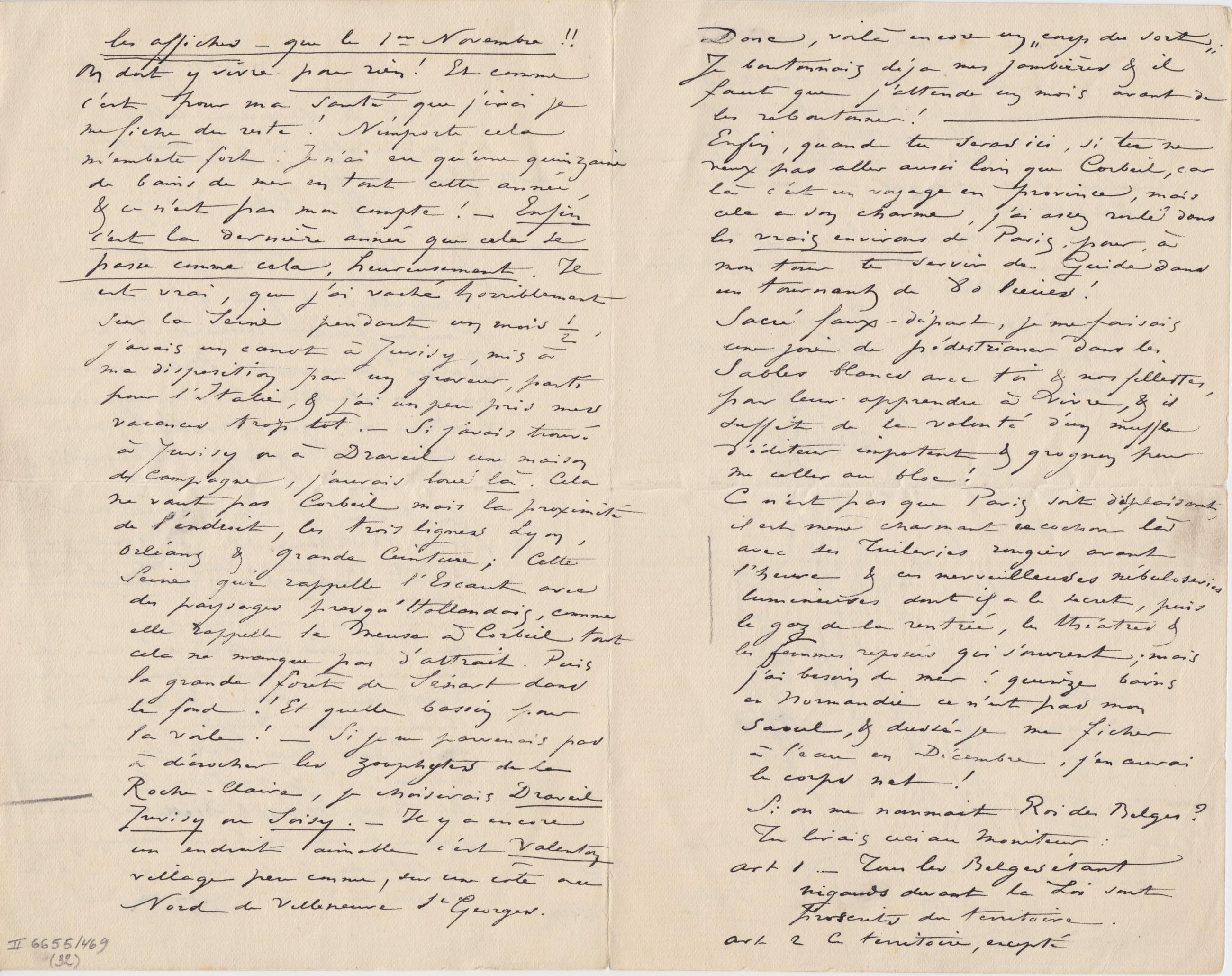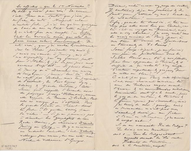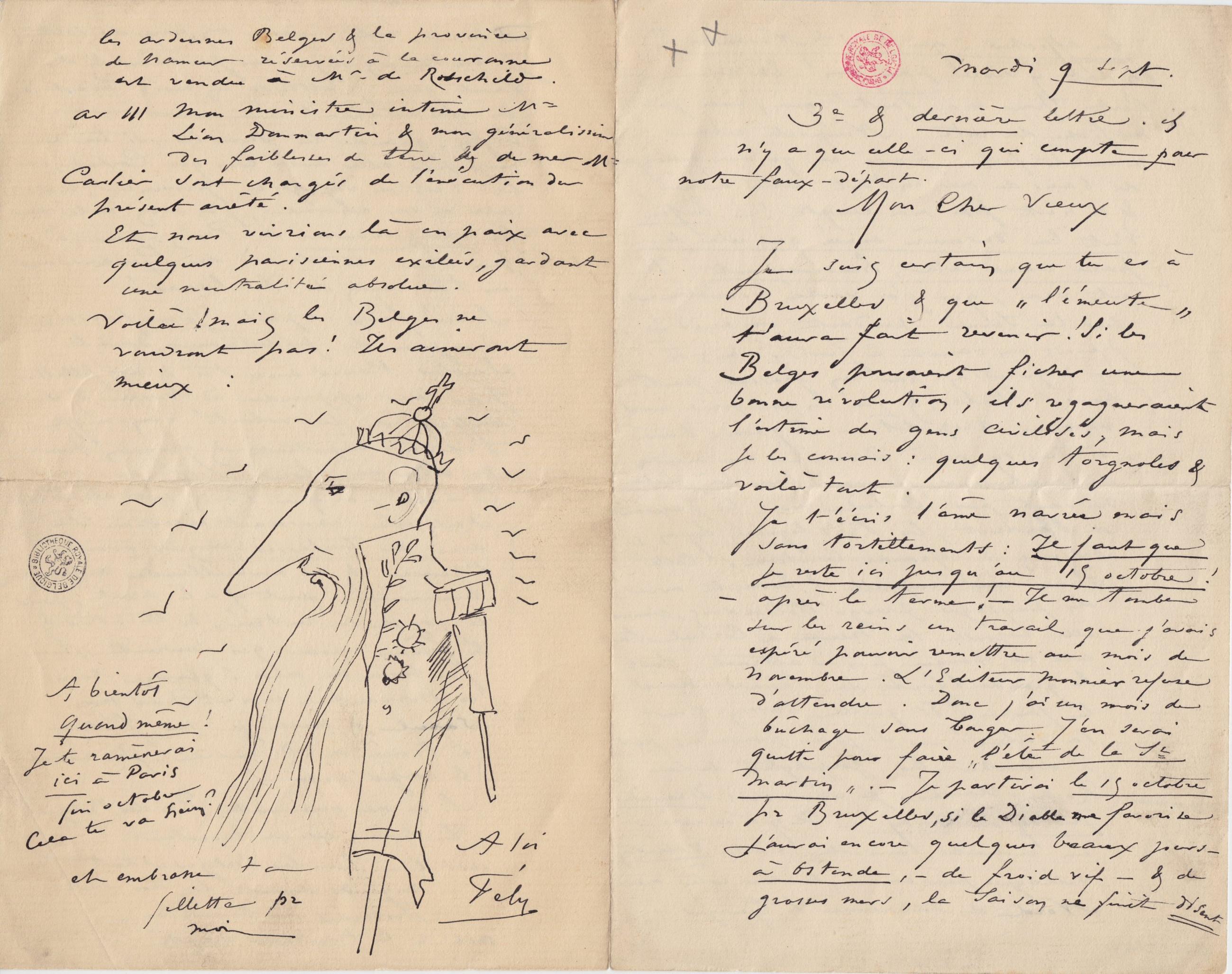 Je t’écris l’âme navrée mais sans tortillements : Il faut que je reste ici jusqu’au 15 octobre ! – après le terme ! – Il me tombe sur les reins un travail que j’avais espéré pouvoir remettre au mois de Novembre. L’Éditeur Monnier refuse d’attendre. Donc j’ai un mois de bûchage sans bouger. J’en serai quitte pour faire « l’été de la St Martin ». – Je partirai le 15 octobre pour Bruxelles, si le Diable me favorise j’aurai encore quelques beaux jours – à Ostende, – de froid vif – & de grosses mers, la Saison ne finit disent