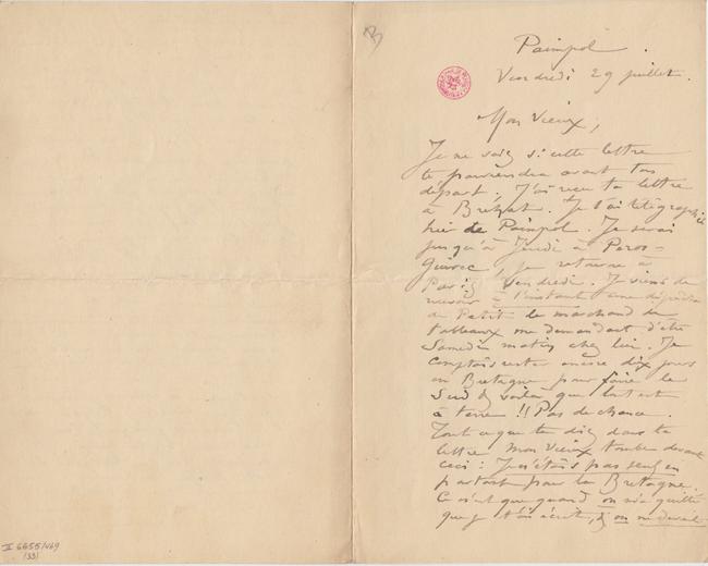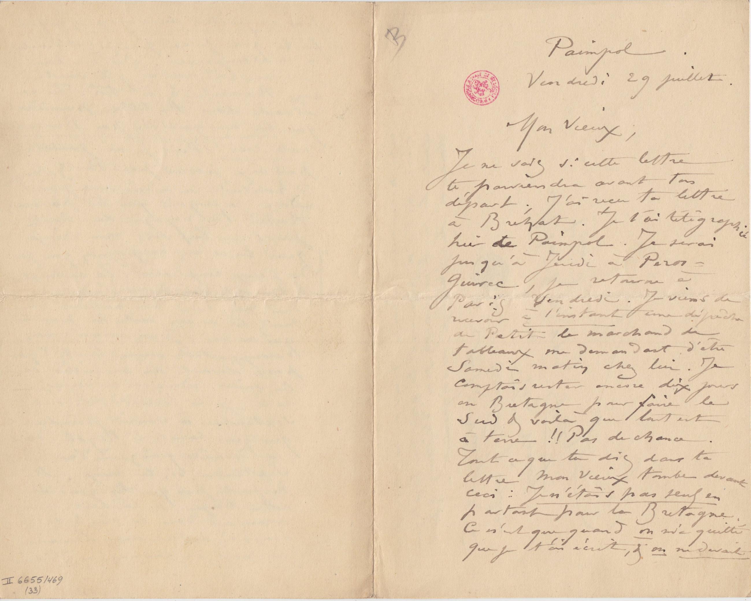 Je ne sais si cette lettre te parviendra avant ton départ. J’ai reçu ta lettre à Bréhat. Je t’ai télégraphié hier de Paimpol. Je serai jusqu’à Jeudi à Peros-Guirec, je retourne à Paris Vendredi. Je viens de recevoir à l’instant une dépêche de Petit le marchand de tableaux me demandant d’être Samedi matin chez lui. Je comptais rester encore dix jours en Bretagne pour faire le Sud & voilà que tout est à terre !! Pas de chance.