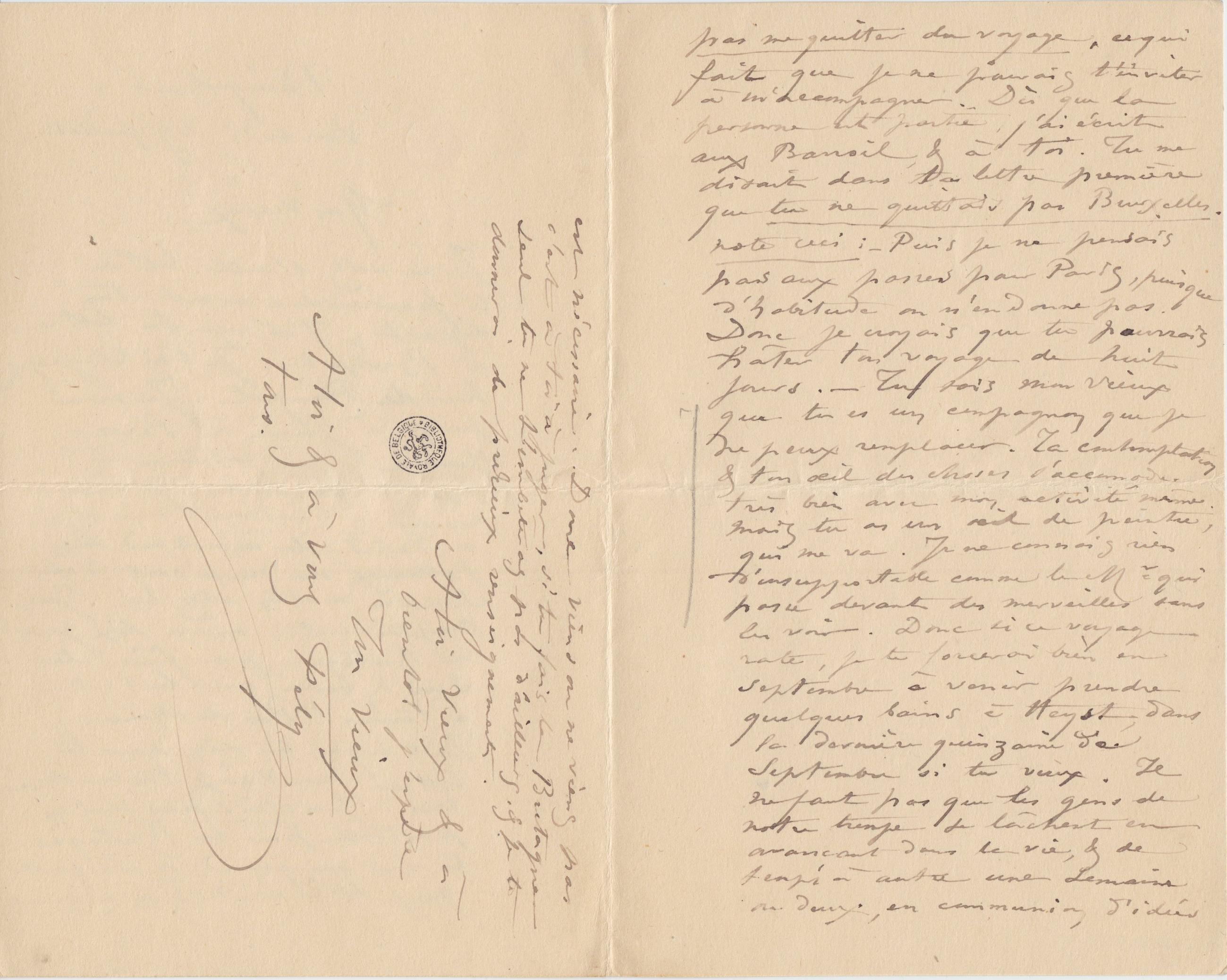 pas me quitter du voyage, ce qui fait que je ne pouvais t’inviter à m’accompagner. Dès que la personne est partie, j’ai écrit aux Barroil & à toi. Tu me disais dans ta lettre première que tu ne quittais pas Bruxelles. Note ceci : – Puis je ne pensais pas aux passes pour Paris, puisque d’habitude on n’en donne pas. Donc je croyais que tu pourrais hâter ton voyage de huit jours. – Tu sais Mon Vieux que tu es un compagnon que je ne peux remplacer. Ta contemplation & ton œil des choses s’accommode très bien avec mon activité même. Mais tu as un œil de peintre, qui me va. Je ne connais rien d’insupportable comme le Mr qui passe devant des merveilles sans les voir. Donc si ce voyage rate, je te forcerai bien en Septembre à venir prendre quelques bains à Heyst, dans la dernière quinzaine de Septembre si tu veux. Il ne faut pas que les gens de notre trempe se lâchent en avançant dans la vie, & de temps à autre une semaine ou deux, en communion d’idées