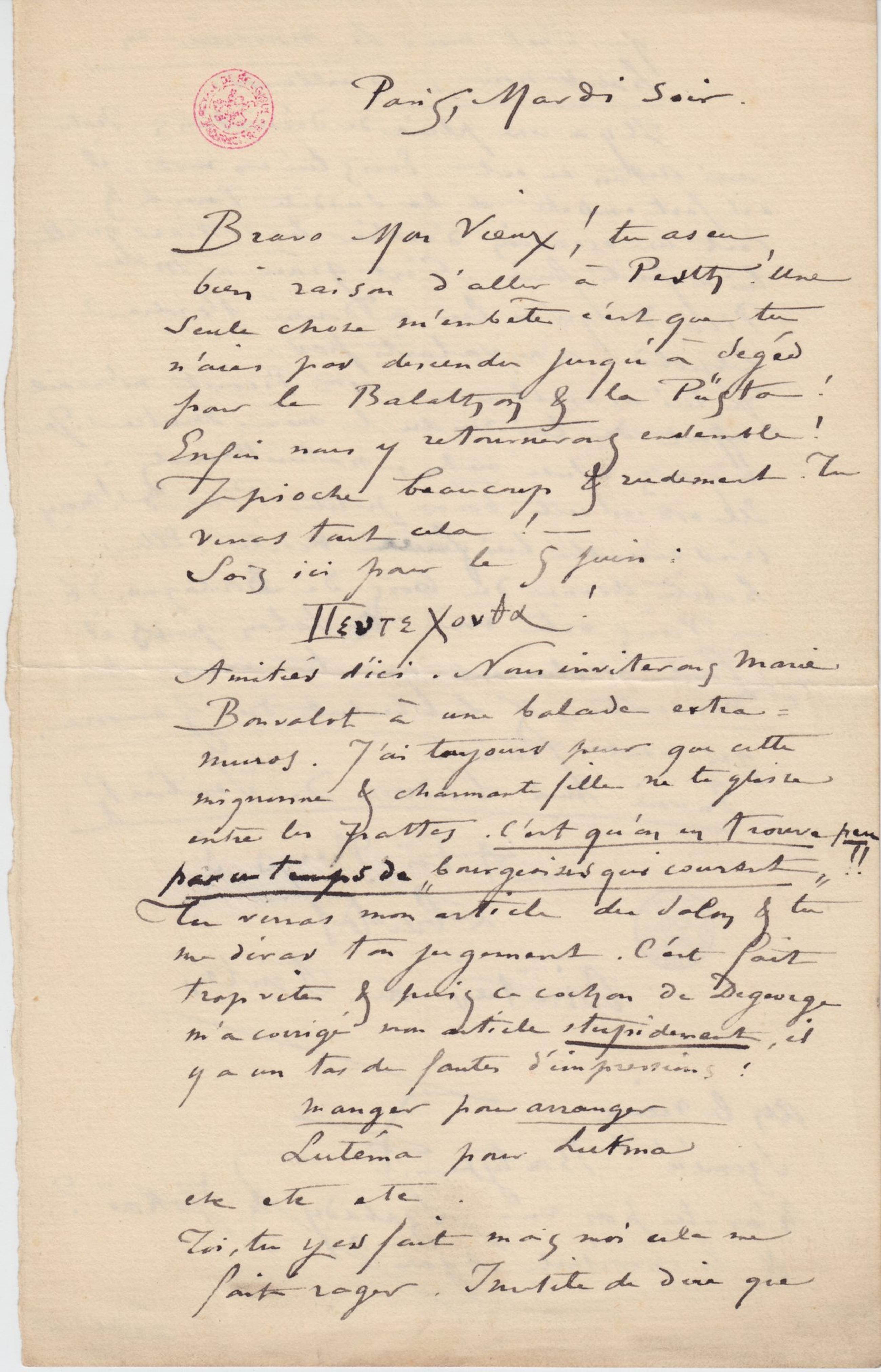 Bravo Mon Vieux ! tu as eu bien raison d’aller à Pesth ! Une seule chose m’embête c’est que tu n’aies pasdescendu jusqu’à Segéd pour le Balathon & la Püsta ! Enfin nous y retournerons ensemble ! Je pioche beaucoup & rudement. Tu verras tout cela ! –