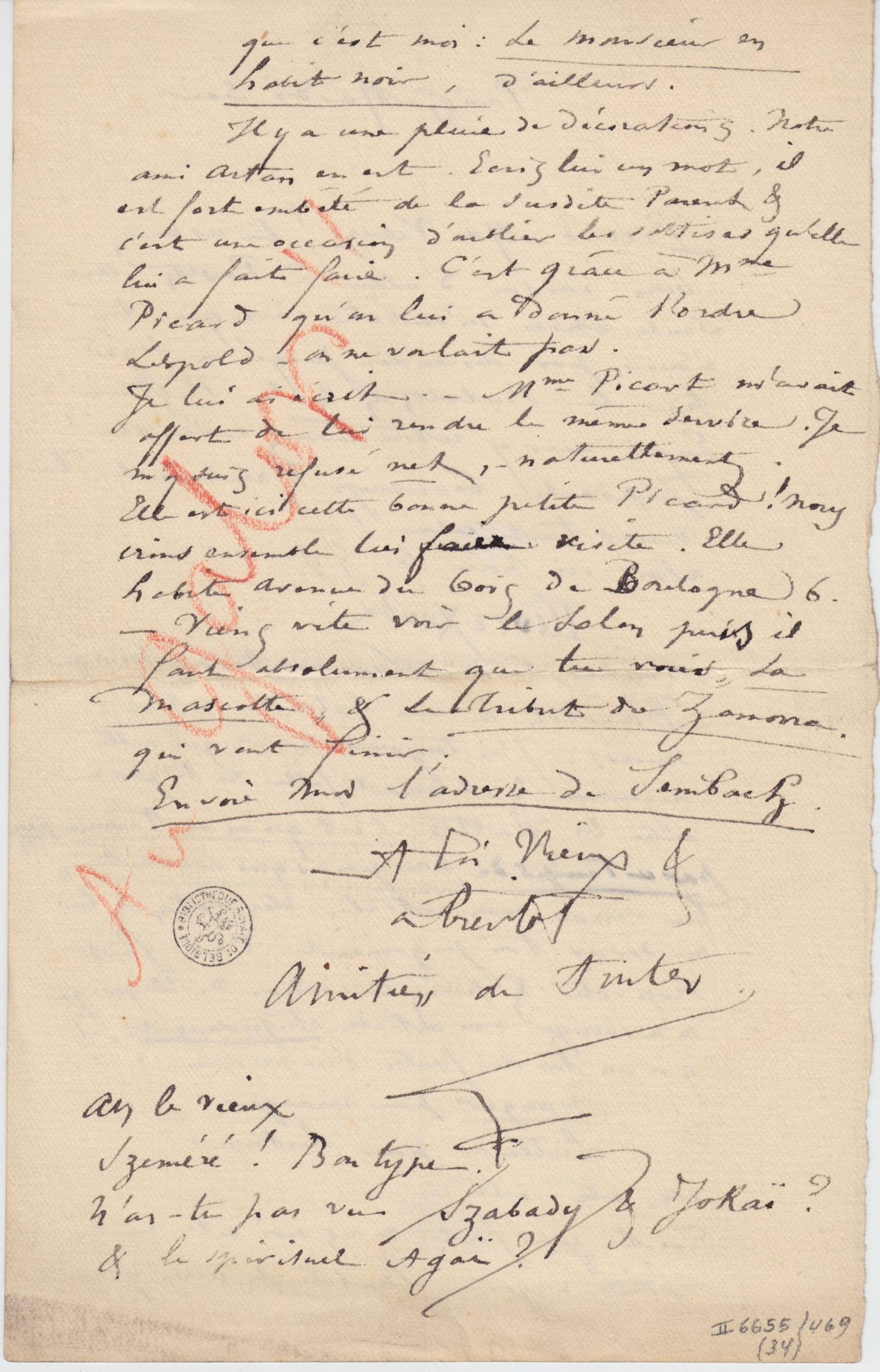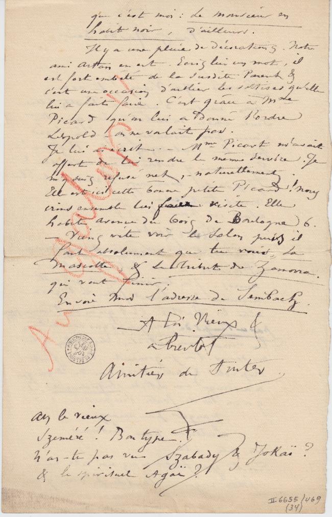 Je lui ai écrit. – Mme Picart m’avait offert de lui rendre le même service. Je m’y suis refusé net, – naturellement. Elle est ici cette bonne petite Picard ! Nous irons ensemble lui faire visite. Elle habite Avenue du bois de Boulogne 6. – Viens vite voir le Salon puis il faut absolument que tu voies, La Mascotte, & la Tribut de Zamona qui vont finir ;