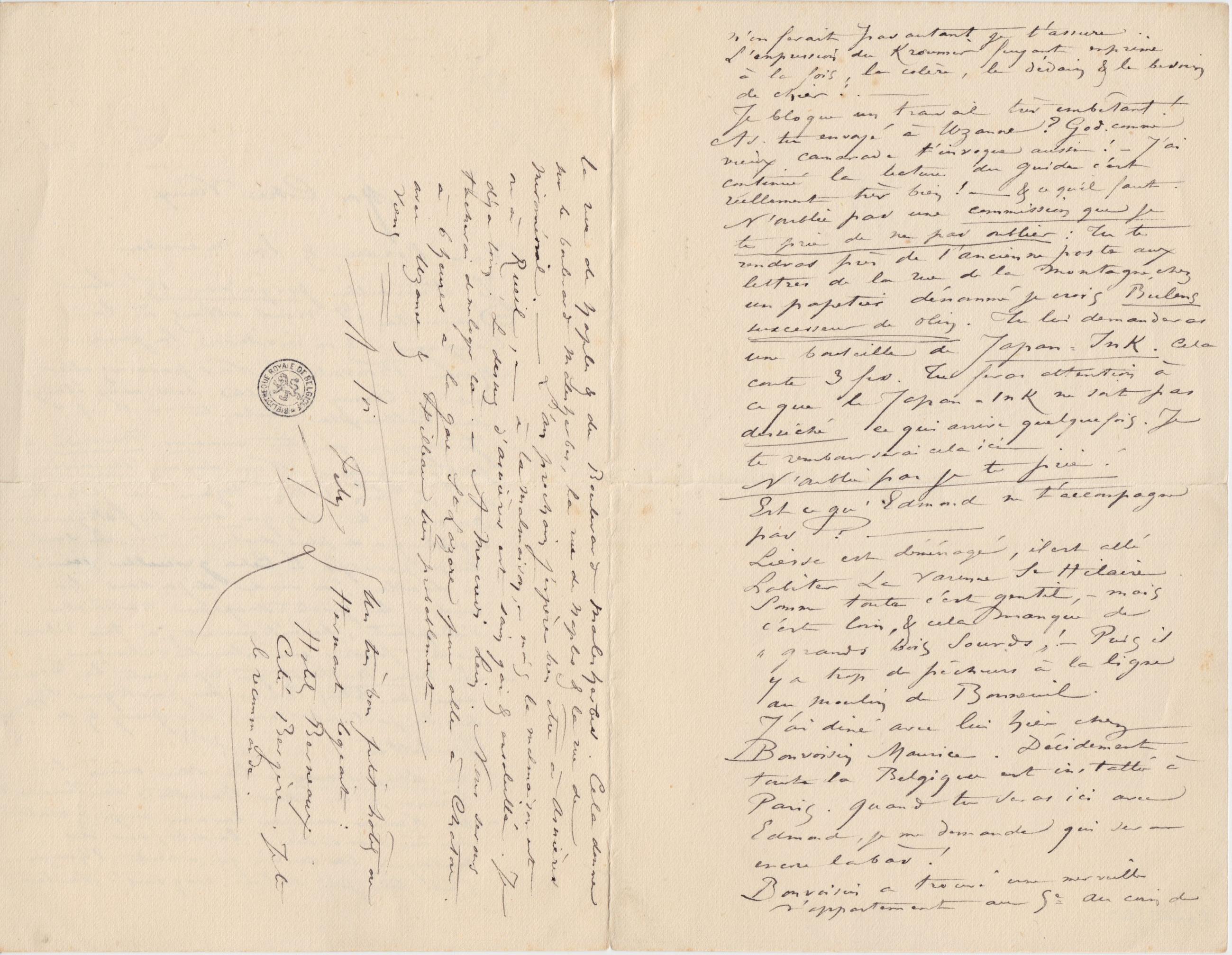 Je bloque un travail très embêtant ! As-tu envoyé à Uzanne ? God. comme vieux camarade t’invoque aussi ! – J’ai continué la lecture du guide c’est réellement très bien ! – & ce qu’il faut. N’oublie pas une commission que je te prie de ne pas oublier : Tu te rendras près de l’ancienne poste aux lettres de la rue de la Montagne, chez un papetier dénommé je crois Bulenssuccesseur de Olin. Tu lui demanderas une bouteille de Japan-Ink. Cela coute 3 frs. Tu feras attention à ce que le Japan-Ink ne soit pas desséché ce qui arrive quelquefois. Je te rembourserai cela ici.