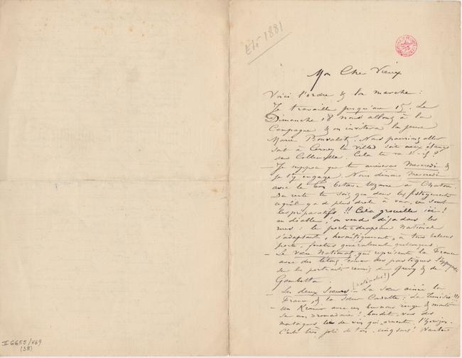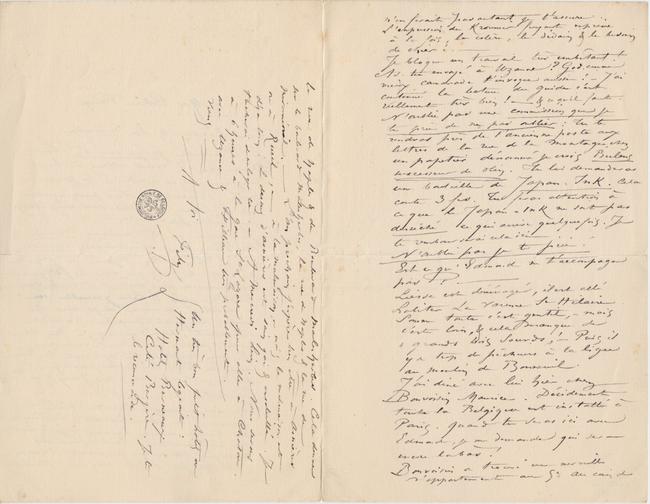 – Je suppose que tu arriveras Mercredi & je t’y engage. Nous dînons Mercredi avec le bon Octave Uzanne à Chatou. Du reste tu sais que dans les festoyements ce qu’il y a de plus drôle à voir, ce sont les préparatifs !! Cela grouille ici ! en diable ! on vend déja dans les rues : le porte-drapeau national s’adaptant « hermétiquement » à tous balcons porte, fenetres généralement quelconques.