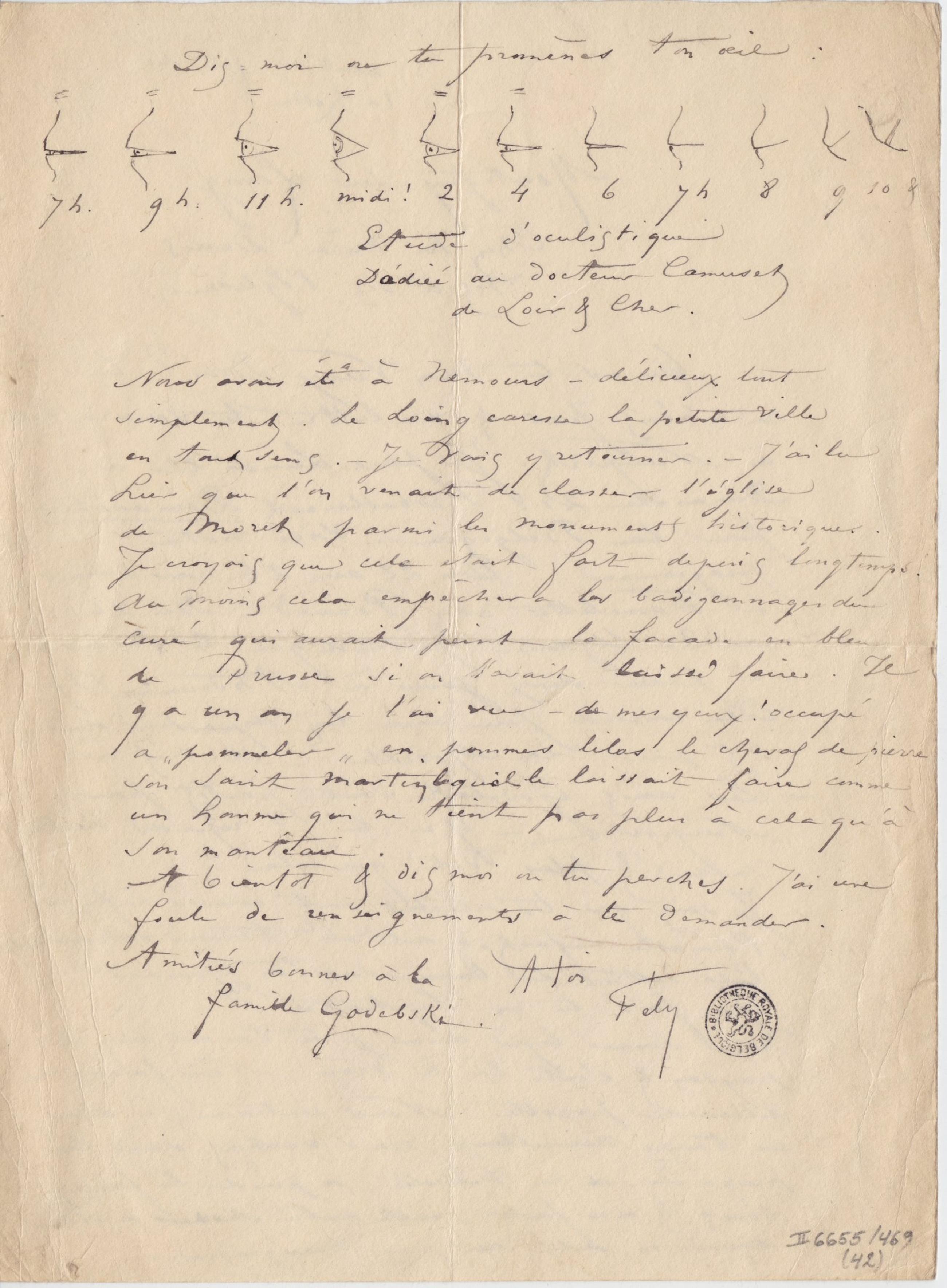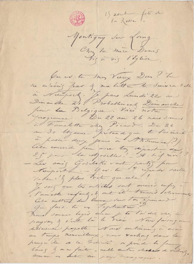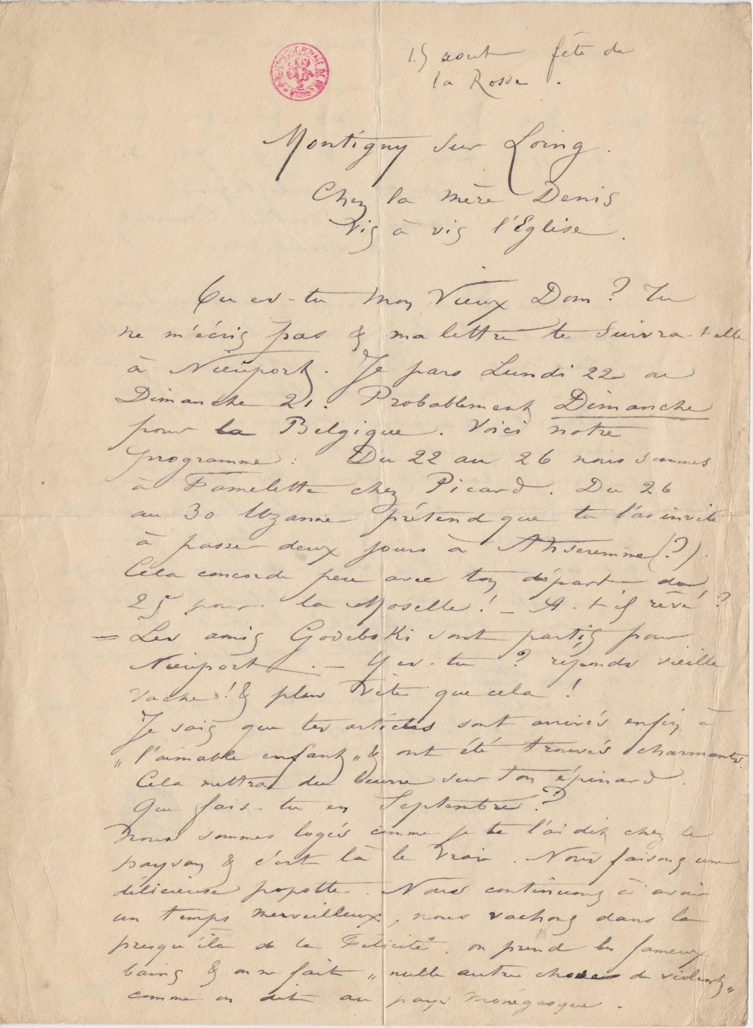 Où es-tu Mon Vieux Dom ? Tu ne m’écris pas & ma lettre te suivra-t elle à Nieuport. Je pars Lundi 22 ou Dimanche 21. Probablement Dimanche pour la Belgique. Voici notre programme : Du 22 au 26 nous sommes à Famelette chez Picard. Du 26 au 30 Uzanne prétend que tu l’as invité à Anseremme (?). Cela concorde peu avec ton départ du 25 pour la Moselle ! – A-t il rêvé ?