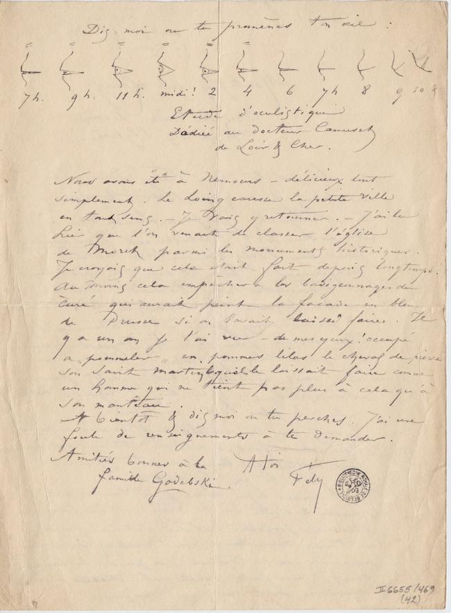 Nous avons été à Nemours – délicieux tout simplement. Le Loing caresse la petite ville en tout sens. Je vais y retourner. – J’ai lu hier que l’on venait de classer l’église de Moret parmi les monuments historiques. Je croyais que cela était fait depuis longtemps. Au moins cela empêchera les badigeonnages du curé qui aurait peint la facade en bleu de Prusse si on l’avait laissé faire. Il y a un an je l’ai vu – de mes yeux ! occupé a « pommeler » en pommes lilas le cheval de pierre son Saint Martin lequel le laissait faire comme un homme qui ne tient pas plus à cela qu’à son manteau.