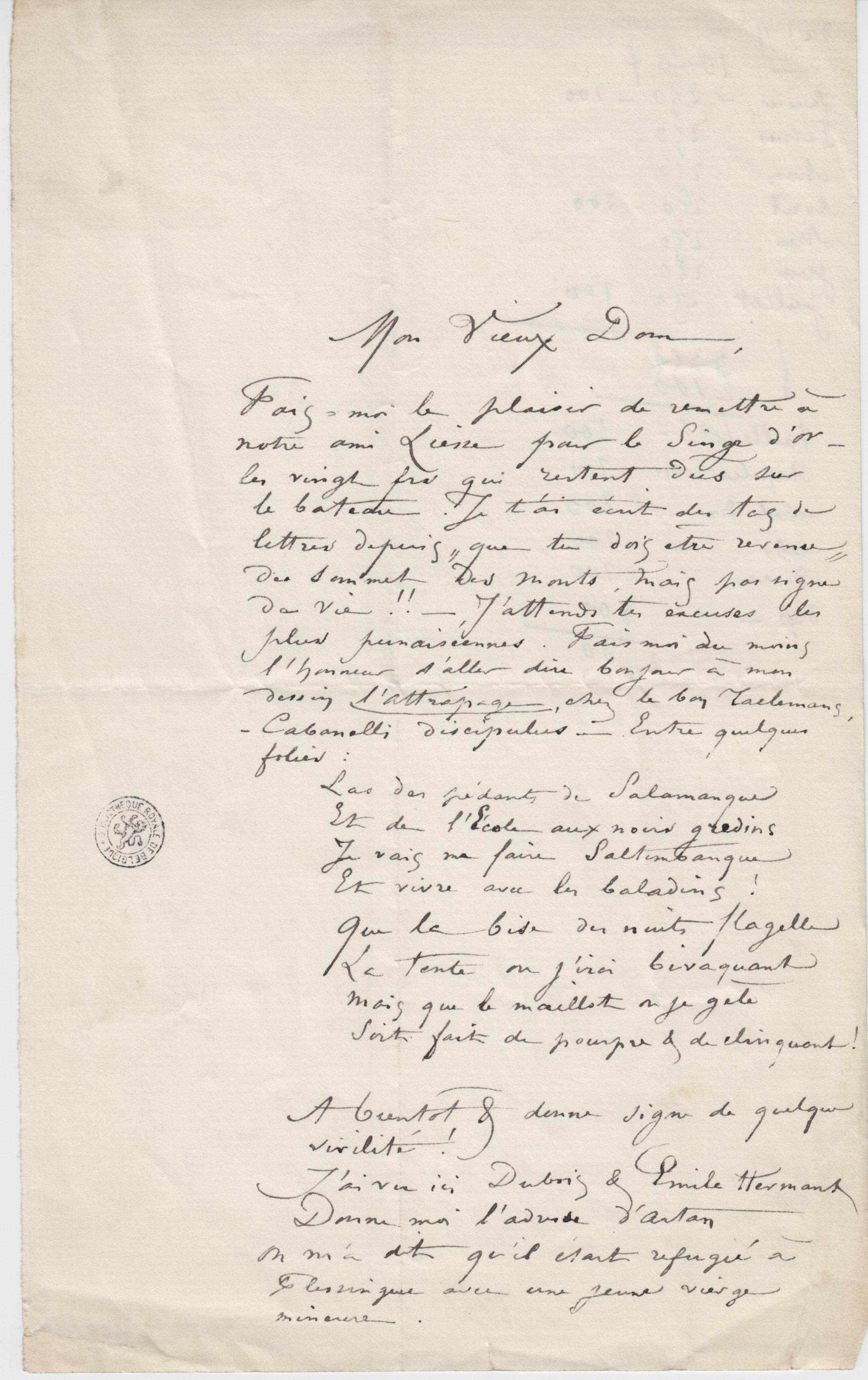 Fais-moi le plaisir de remettre à notre ami Liesse pour le Singe d’Or – les vingt frs qui restent dûs sur le bateau. Je t’ai écrit des tas de lettres depuis « que tu dois être revenu » du sommet des monts, mais pas signe de vie !! – J’attends tes excuses les plus punaisiéennes. Fais moi du moins l’honneur d’aller dire bonjour à mon dessin l’Attrapage, chez le bon Taelemans, – Cabanelli discipulus – Entre quelques folies :
