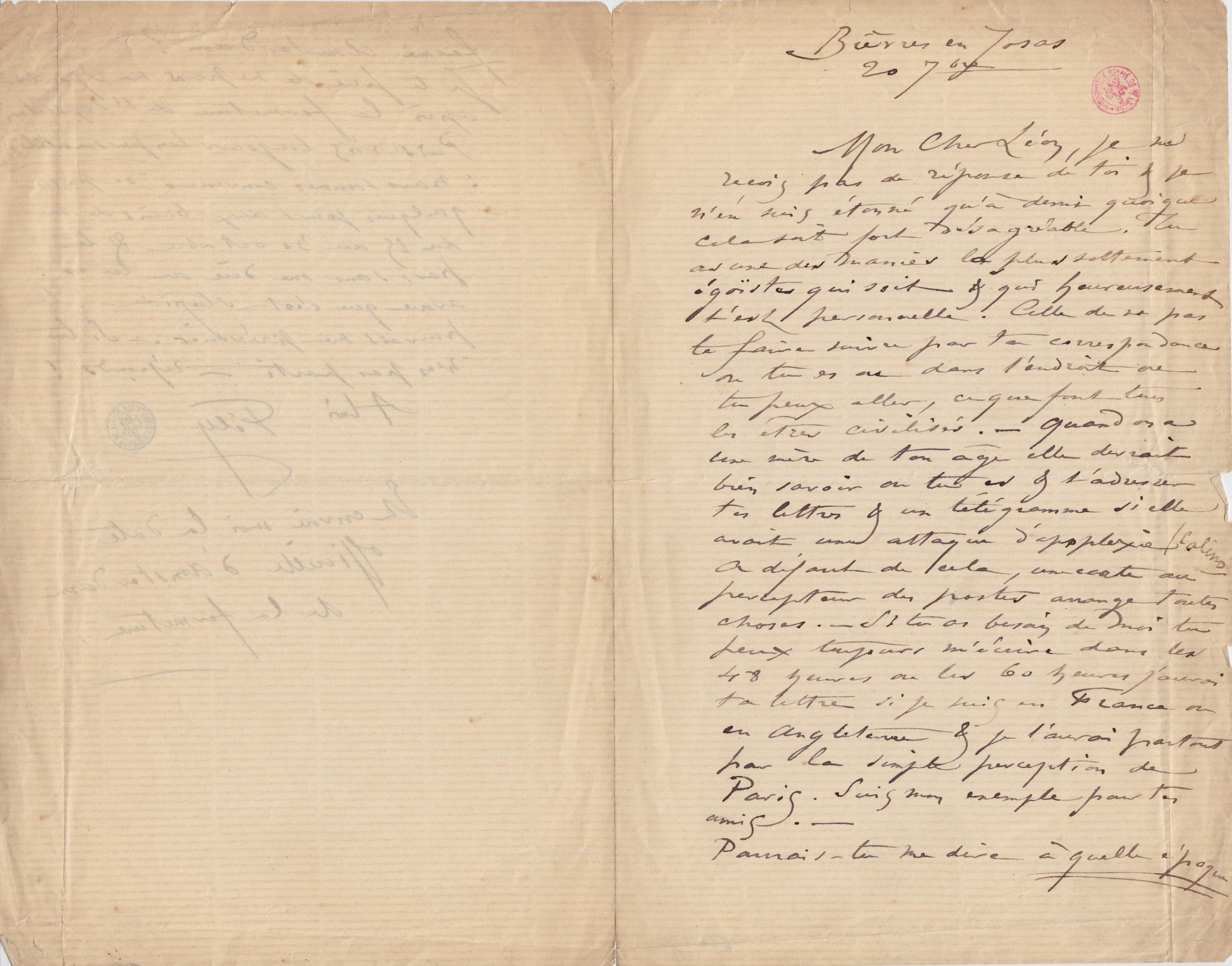 Je ne reçois pas de réponse de toi & je n’en suis étonné qu’à demi quoique cela soit fort désagréable. Tu as une des manies la plus sottement égoïste qui soit & qui heureusement t’est personnelle. Celle de ne pas te faire suivre par ta correspondance où tu es ou dans l’endroit où tu peux aller, ce que font tous les êtres civilisés. – Quand on a une mère de ton âge elle devrait bien savoir où tu es & t’adresser tes lettres & un télégramme si elle avait une attaque d’apoplexie. À défaut de cela, une carte au percepteur des postes arrange toutes choses. – Si tu as besoin de moi tu peux toujours m’écrire dans les 48 heures ou les 60 heures j’aurai ta lettre si je suis en France ou en Angleterre & je l’aurai partout par la simple perception de Paris. Suis mon exemple pour tes amis. –