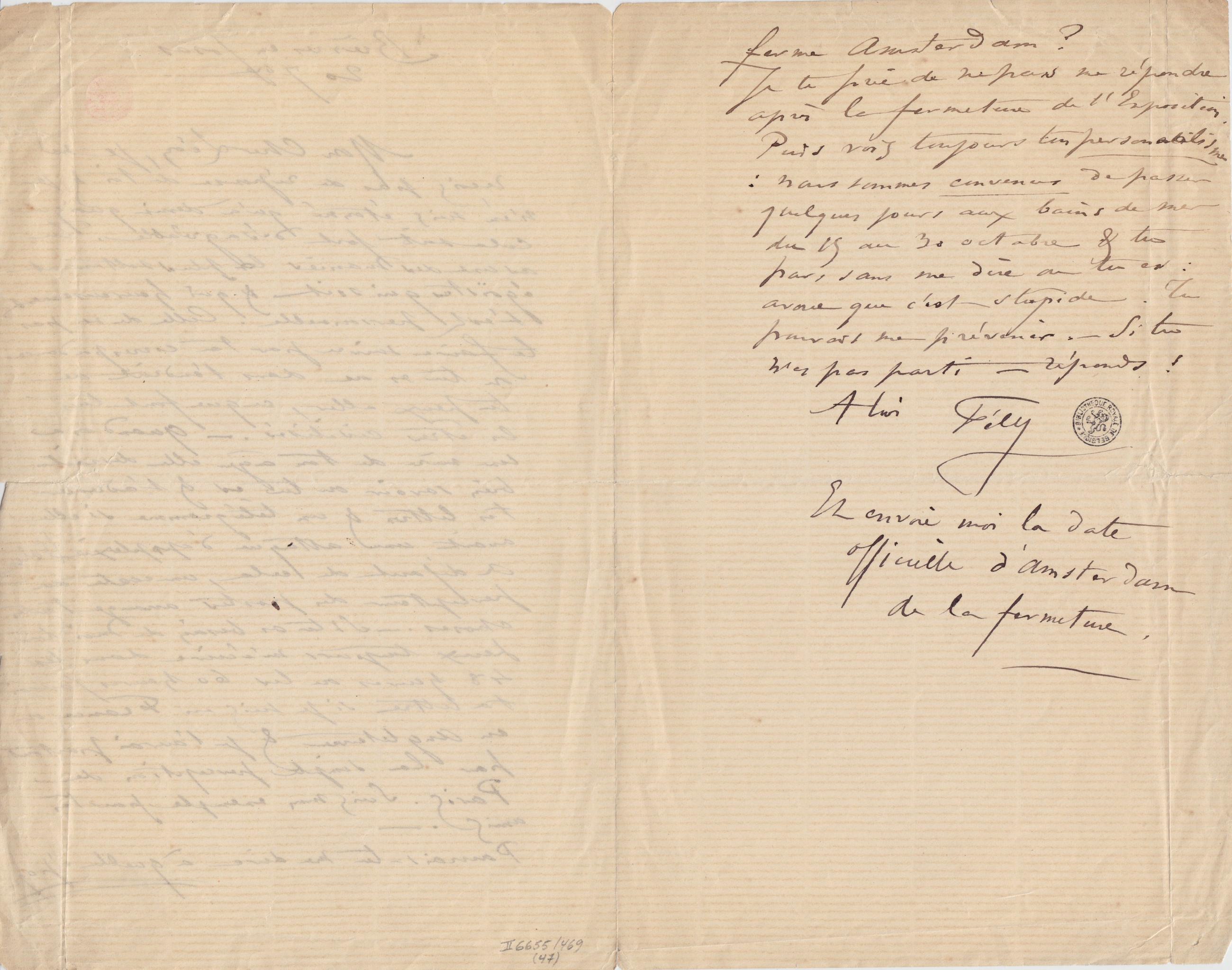 Je te prie de ne pas me répondre après la fermeture de l’Exposition. Puis vois toujours ton personnalisme : nous sommes convenus de passer quelques jours aux bains de mer du 15 au 30 octobre & tu pars sans me dire où tu es : avoue que c’est stupide. Tu pouvais me prévenir. – Si tu n’es pas parti – réponds !