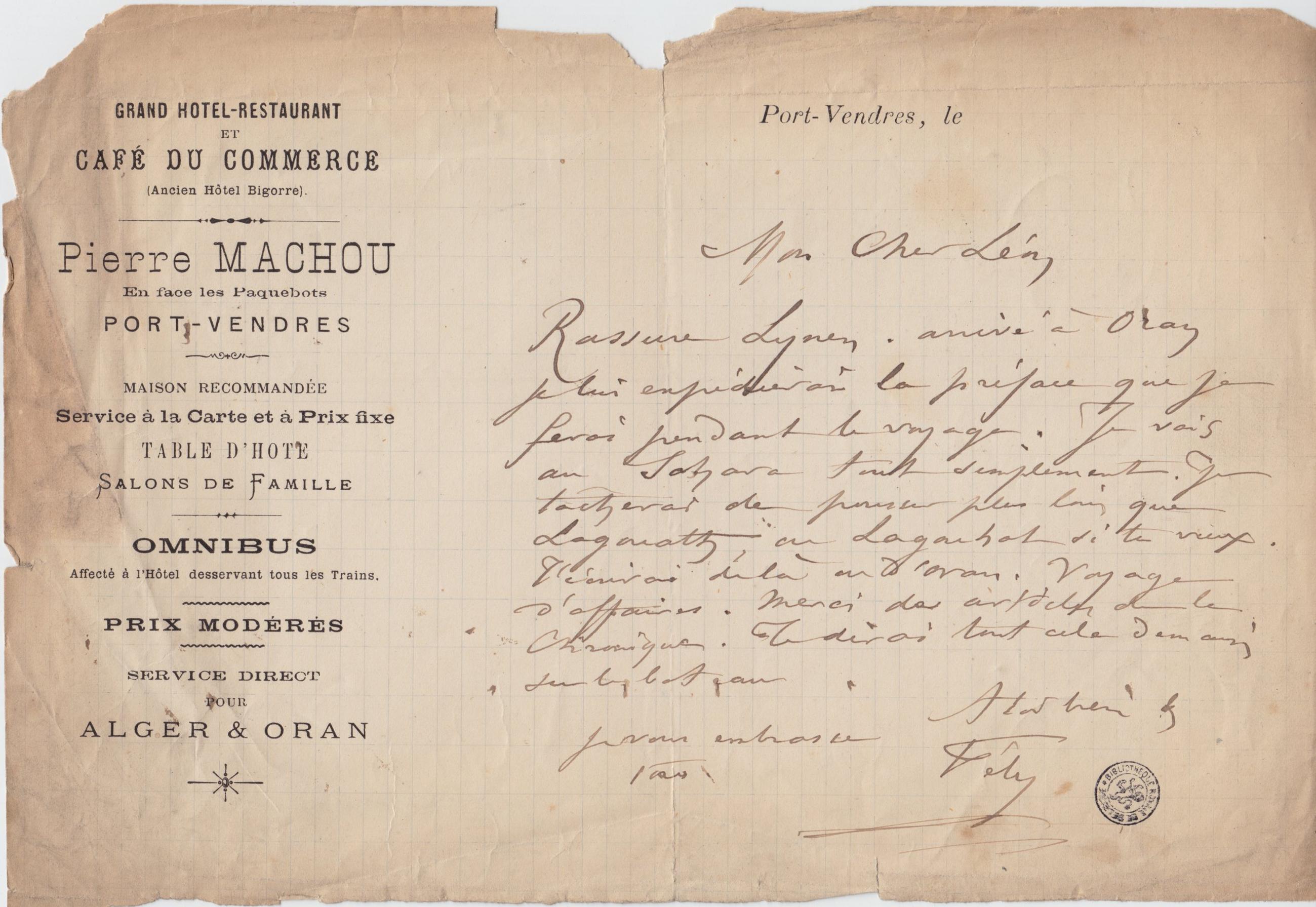Écrite en Plume Noir. En-tête: GRAND HOTEL-RESTAURANT ET CAFE DU COMMERCE / PIERRE MACHOU.