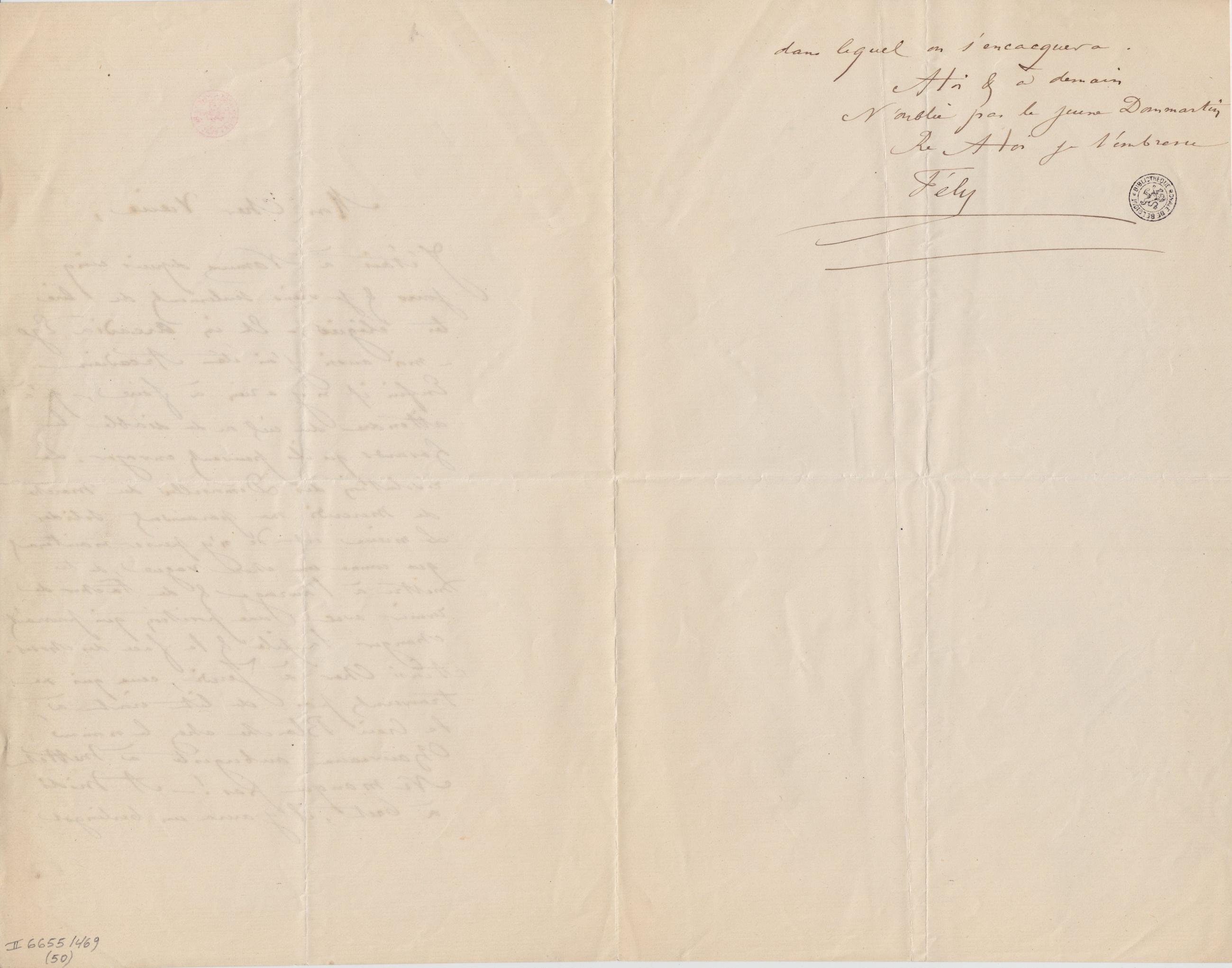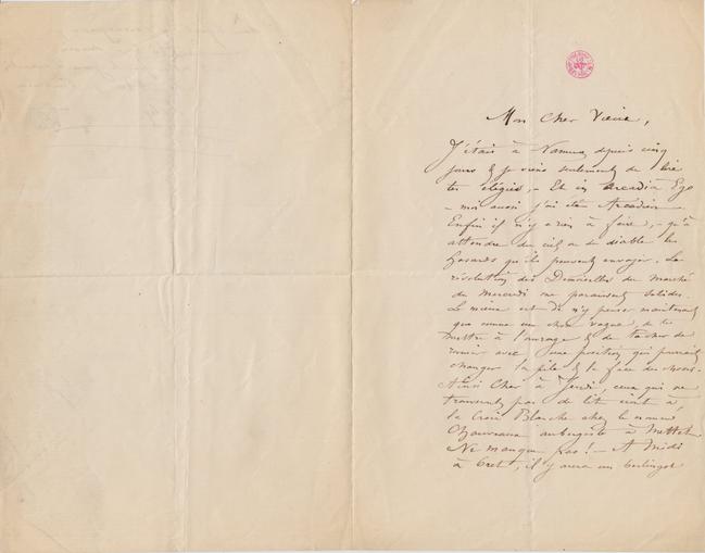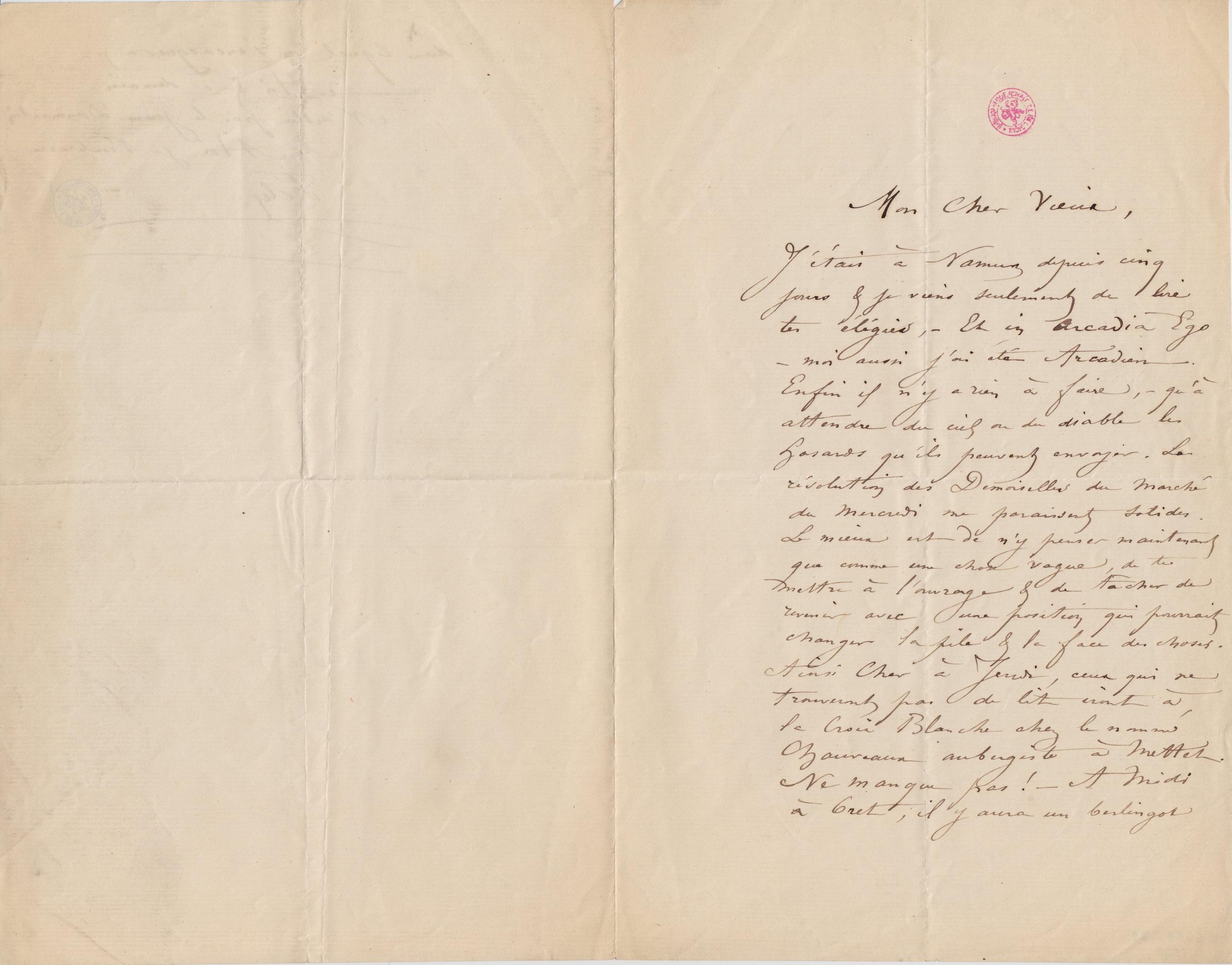 J’étais à Namur depuis cinq jours & je viens seulement de lire tes élogies, – Et in Arcadia Ego – moi aussi j’ai été Arcadien. Enfin il n’y a rien à faire, – qu’à attendre du ciel ou du diable les hasards qu’ils peuvent envoyer. La révolution des Demoiselles du marché du mercredi me paraissent solides. Le mieux est de n’y penser maintenant que comme une chose vague, de te mettre à l’ouvrage & de tâcher de revenir avec une position qui pourrait changer la pile & la face des choses. Ainsi Cher à Jeudi, ceux qui ne trouvent pas de lit iront à la Croix Blanche chez le nommé Chauveaux aubergiste à Mettet. Ne manque pas ! – À Midi à Oret, il y aura un berlingot