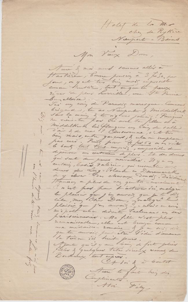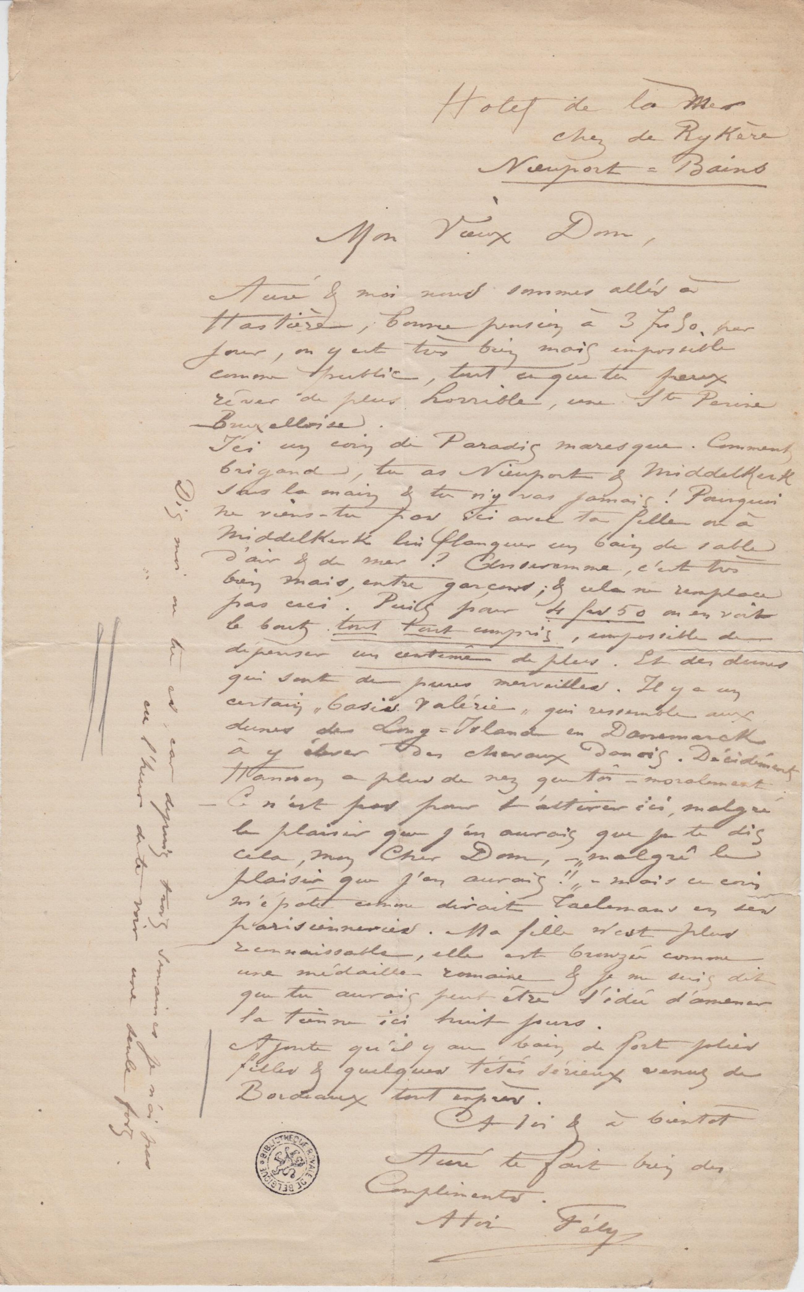 – Ce n’est pas pour t’attirer ici, malgré le plaisir que j’en aurais que je te dis cela, Mon Cher Dom, – « malgré le plaisir que j’en aurais !! » – mais ce coin m’épâte comme dirait Taelemans en ses parisienneries. Ma fille n’est plus reconnaissable, elle est bronzée comme une médaille romaine & je me suis dit que tu aurais peut être l’idée d’amener la tienne ici huit jours.