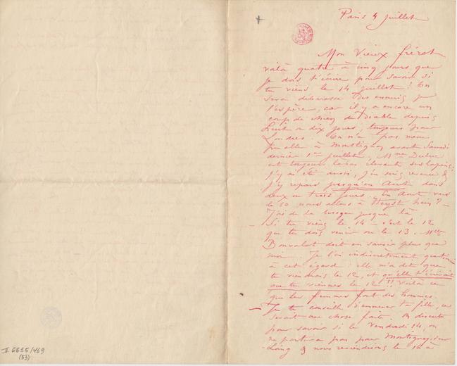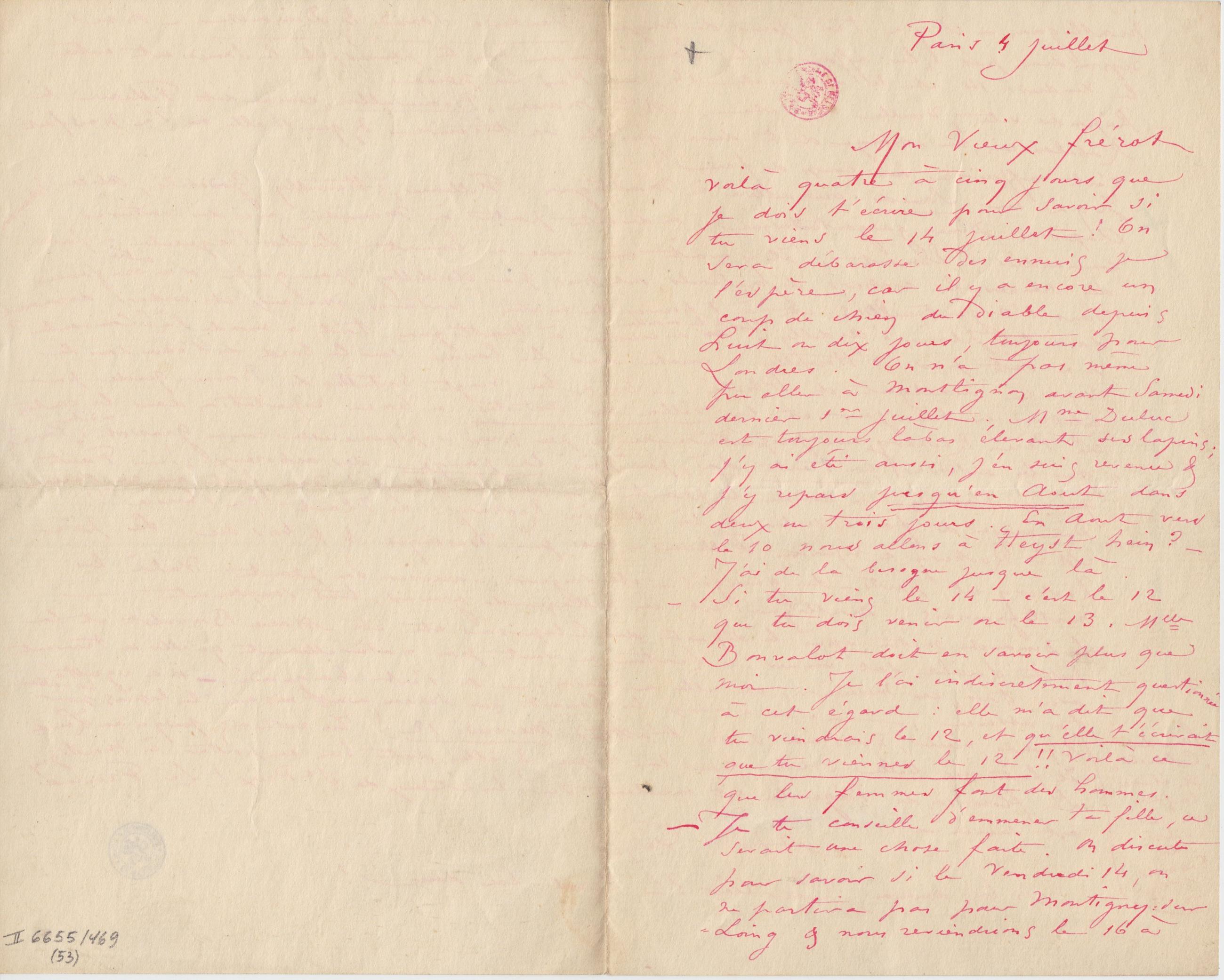 Voila quatre à cinq jours que je dois t’écrire pour savoir si tu viens le 14 juillet ! On sera débarrassé des ennuis je l’espère, car il y a encore un coup de chien du diable depuis huit ou dix jours, toujours pour Londres. On n’a pas même pu aller à Montlignon avant Samedi dernier 1er juillet. Mme Duluc est toujours làbas élevant ses lapins ; J’y ai été aussi, j’en suis revenu & j’y repars jusqu’en Aout dans deux ou trois jours. En Aout vers le 10 nous allons à Heyst hein ? – J’ai de la besogne jusque là.