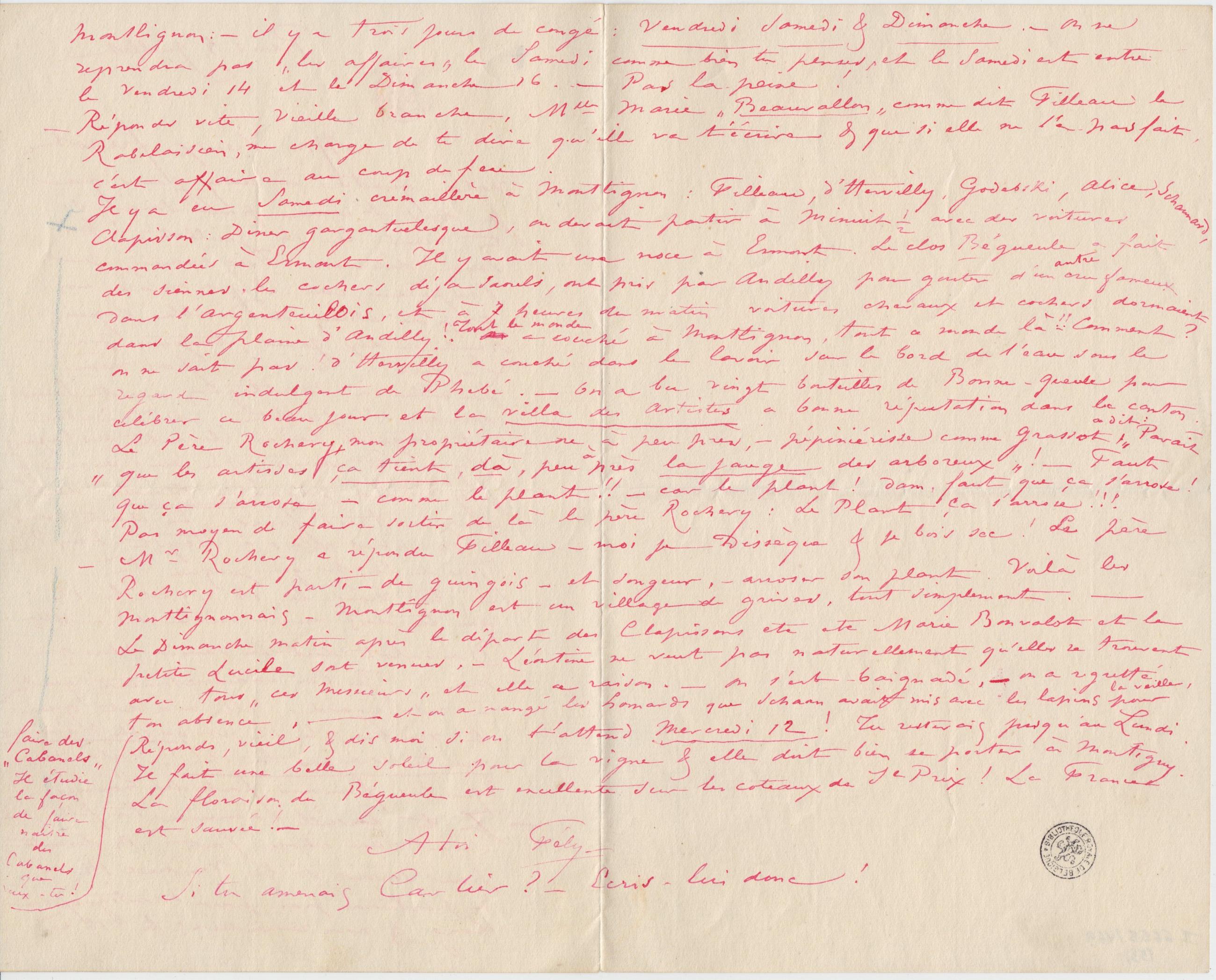 Il y a eu Samedi crémaillère à Montlignon ; Filleau, d’Hervilly, Godebski, Alice, Schaunard, Clapisson : Diner gargantuelesque, on devait partir à minuit ½ avec des voitures commandées à Ermont. Il y avait une noce à Ermont. Le clos Bégueule a fait des siennes, les cochers déja saouls, ont pris par Andilly pour goûter d’un on Tout le monde a couché à Montlignon, tout ce monde là. Comment ? On ne sait pas ! d’Hervilly a couché dans le lavoir sur le bord de l’eau sous le regard indulgent de Phebé. – On a bu vingt bouteilles de Bonne-Gueule pour célébrer ce beau jour et la villa des Artistes a bonne réputation dans le canton. Le Père Rochery, mon propriétaire ou à peu près, – pépiniérisse comme Grassot.