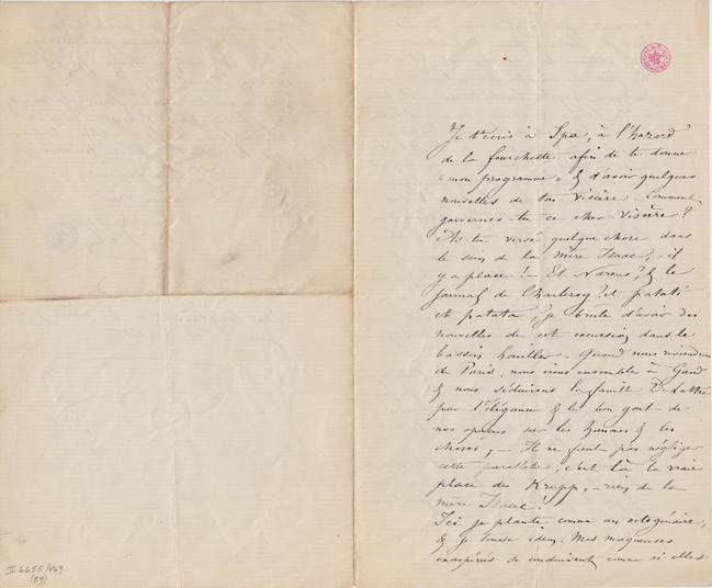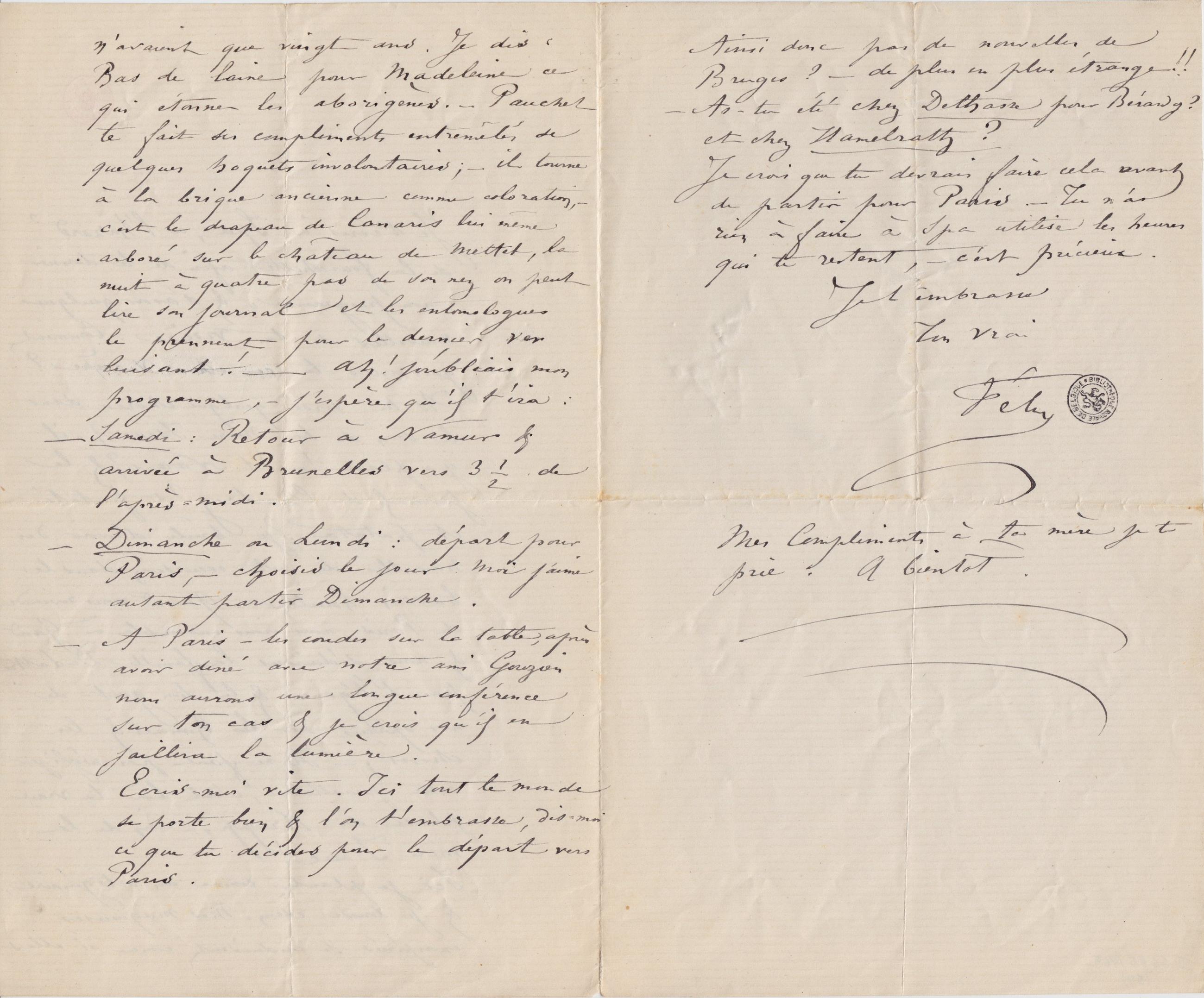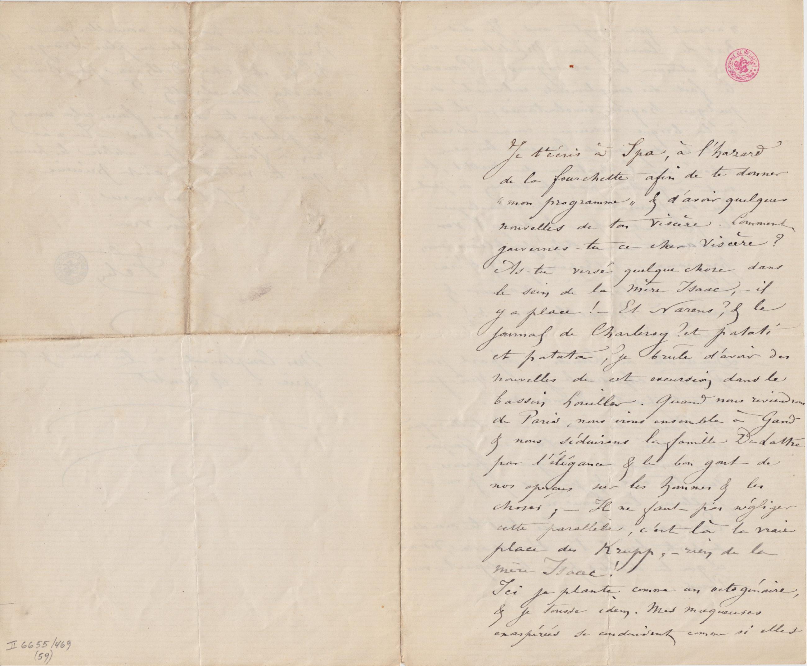 Je t’écris à Spa, à l’hasard de la fourchette afin de te donner « mon programme » & d’avoir quelques nouvelles de ton viscère. Comment gouvernes-tu ce cher viscère ? As-tu versé quelque chose dans le sein de la mère Isaac, – il y a place ! – Et Narens ? & le journal de Charleroy ? et patati et patata ? je brûle d’avoir des nouvelles de cet excursion dans le bassin houiller. Quand nous reviendrons de Paris, nous irons ensemble à Gand & nous séduirons la famille De Lattre par l’élégance & le bon gout de nos aperçus sur les hommes & les choses ; – Il ne faut pas négliger cette parallèle, c’est là la vraie place des Krupp, – rien de la mère Isaac !