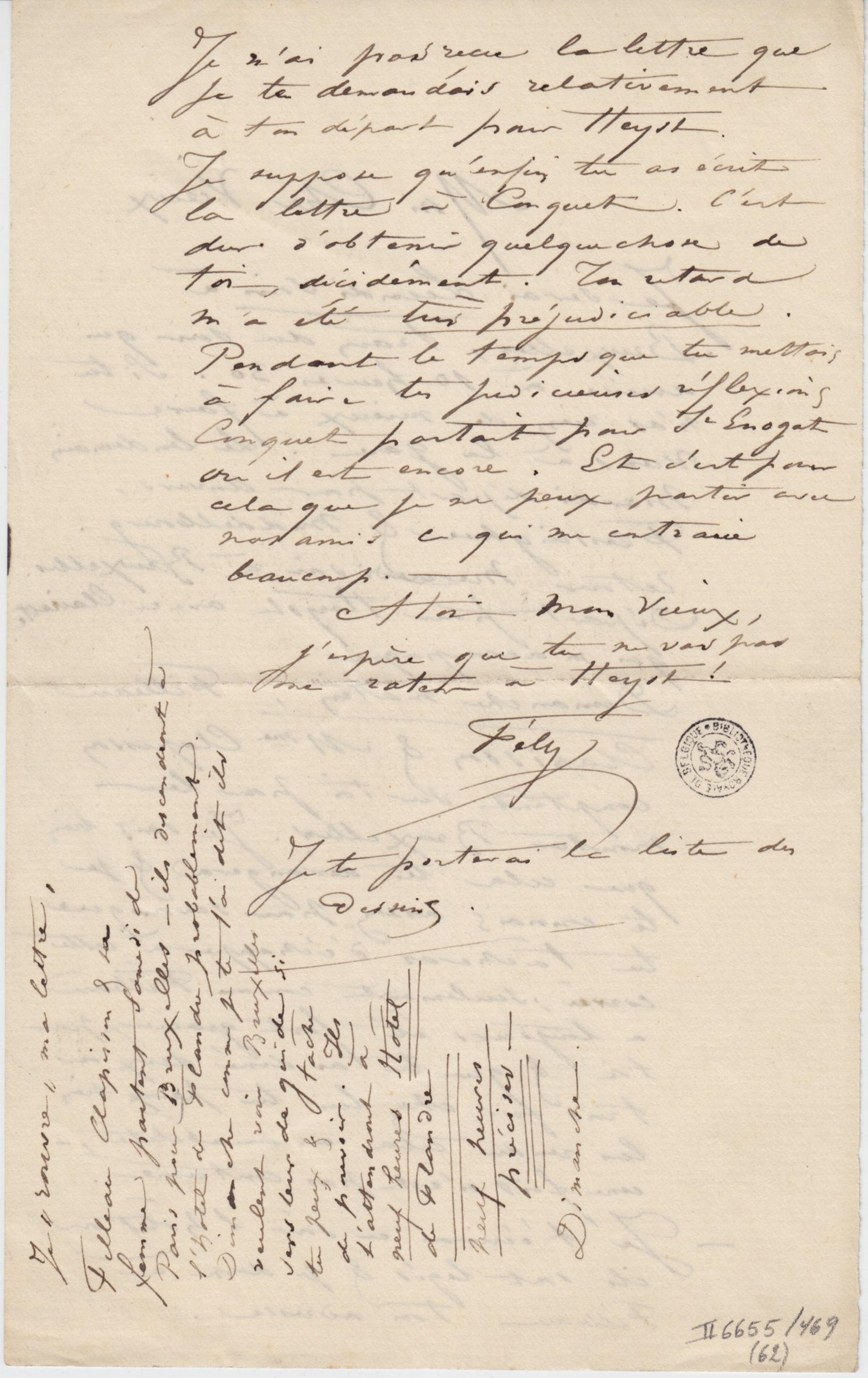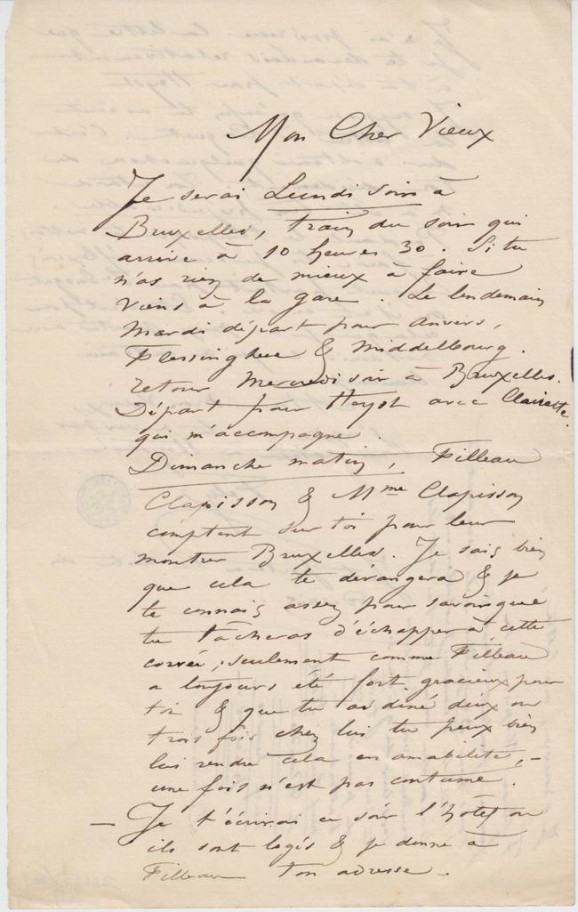 Filleau, Clapisson & sa femme partent Samedi de Paris pour Bruxelles – ils descendent à l’hotel de Flandre probablement. Dimanche comme je te l’ai dit ils veulent voir Bruxelles Sers leur de guide si tu peux & tâche de pouvoir. Ils t’attendront à neuf heures Hôtel de Flandre Neuf heures précises – Dimanche.