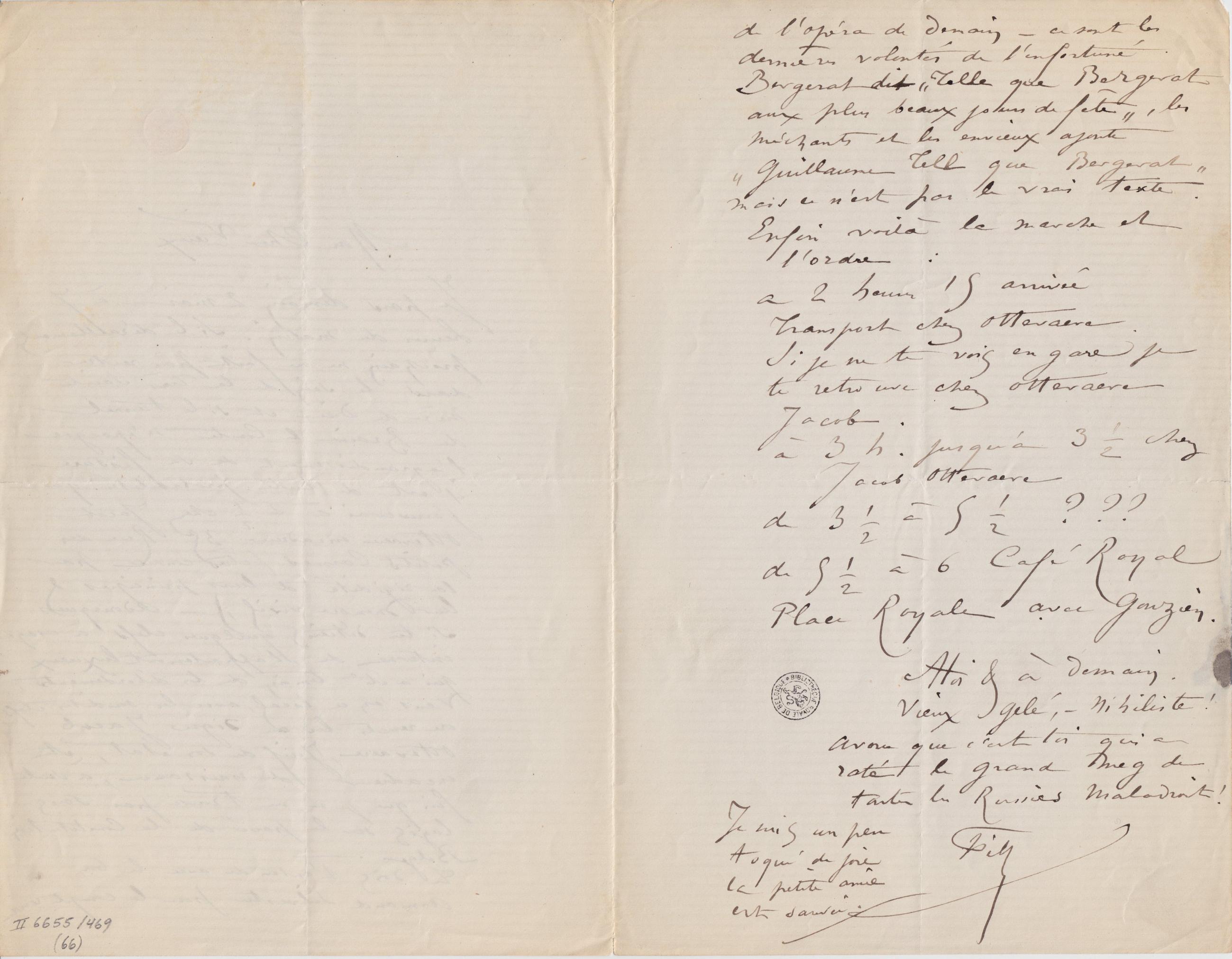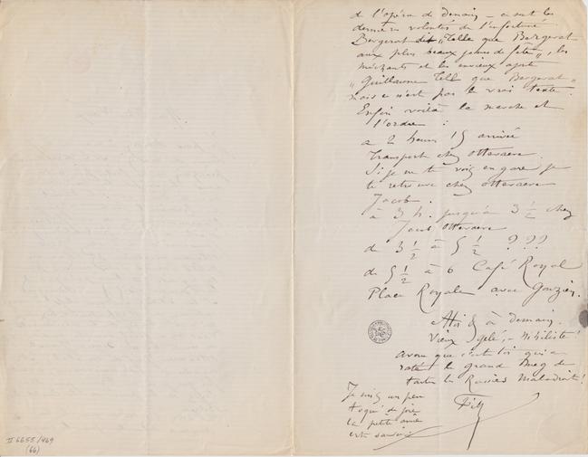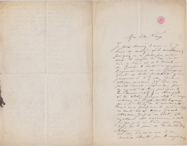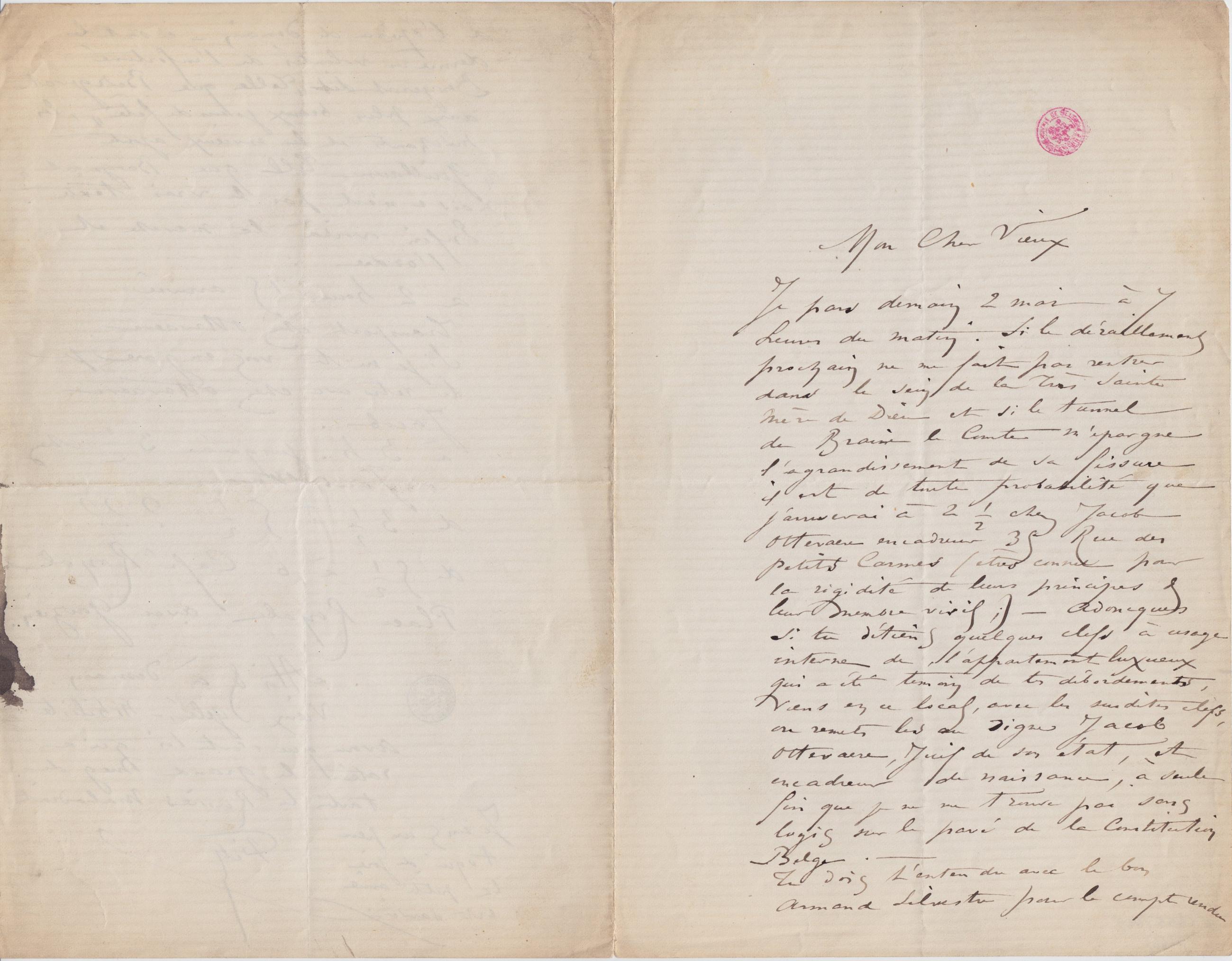 Je pars demain 2 mai à 7 heures du matin. Si le déraillement prochain ne me fait pas rentrer dans le sein de la Très Sainte Mère de Dieu et si le tunnel de Braine le Comte m’épargne l’agrandissement de sa fissure il est de toute probabilité que j’arriverai à 2 ½ chez Jacob Ottevaere encadreur 35 Rue des petits Carmes (êtres connu pour la rigidité de leurs principes & leur membre viril ;) – Adoncques si tu détiens quelques clefs à usage interne de l’appartement luxueux qui a été témoin de tes débordements, Viens en ce local, avec les susdits clefs, ou remets les au digne Jacob Ottevaere, Juif de son état, et encadreur de naissance, à seule fin que je ne me trouve pas sans logis sur le pavé de la Constitution Belge. –