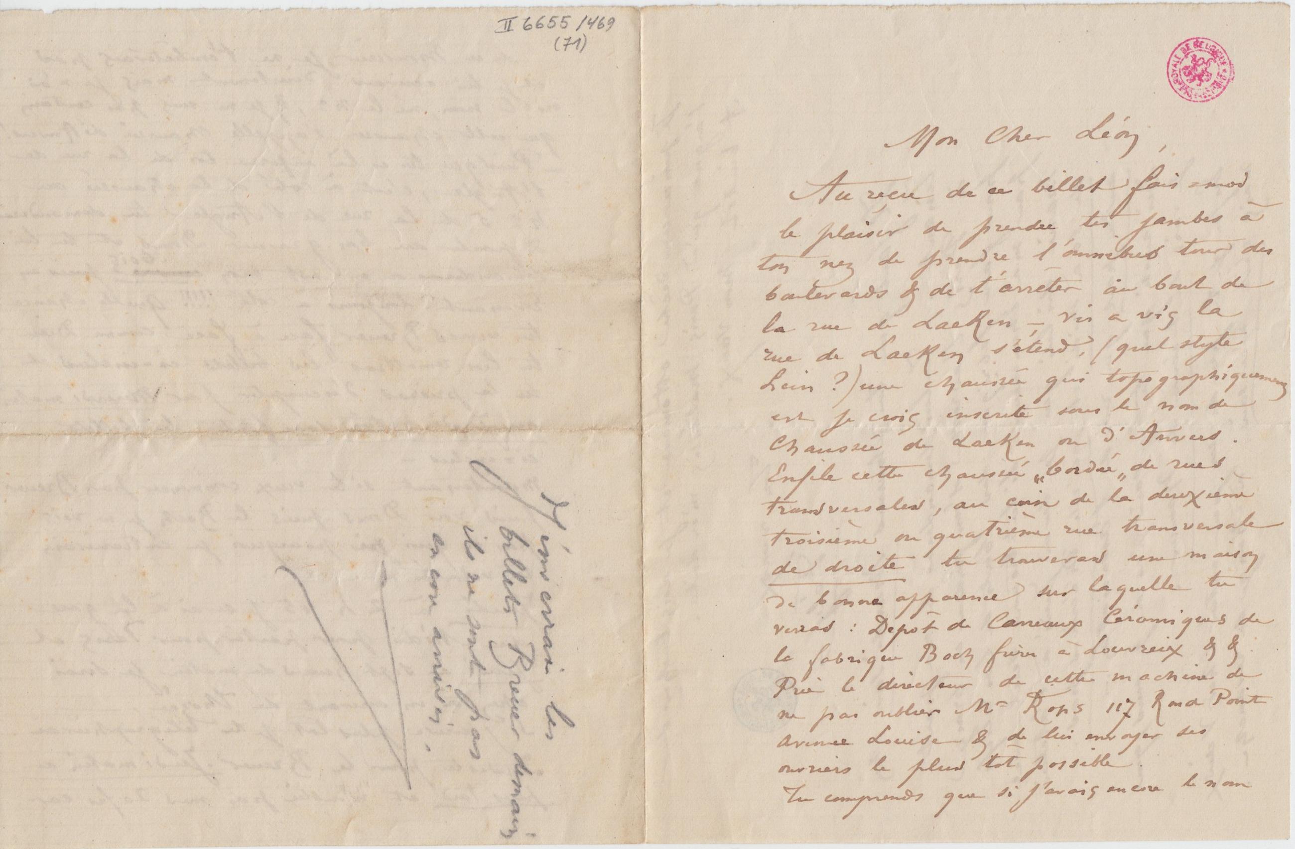 Au reçu de ce billet fais-moi le plaisir de prendre tes jambes à ton nez de prendre l’omnibus tour des boulevards & de t’arrêter au bout de la rue de Laeken – vis à vis la rue de Laeken s’étend, (quel style hein ?) une chaussée qui topographiquement est je crois inscrite sous le nom de Chaussée de Laeken ou d’Anvers. Enfile cette chaussée « bordée » de rues transversales, au coin de la deuxième troisième ou quatrième rue transversale de droite tu trouveras une maison de bonne apparence sur laquelle tu verras : Dépôt de Carreaux Céramiques de la fabrique Boch frères à Louvreix & &