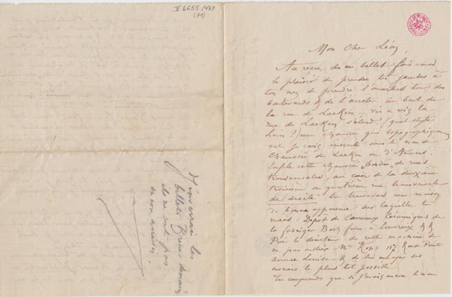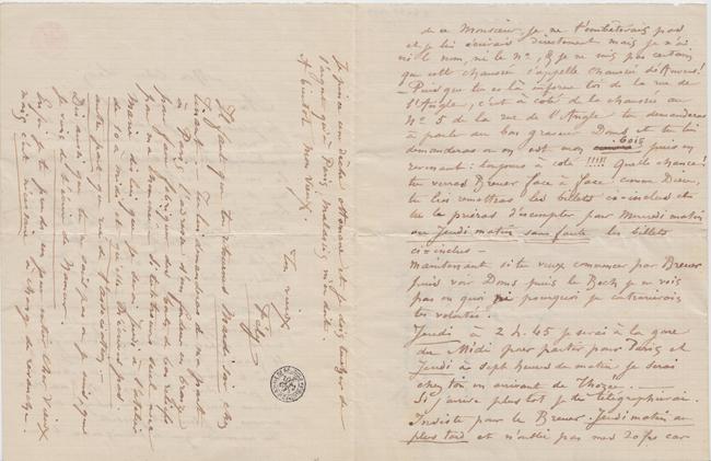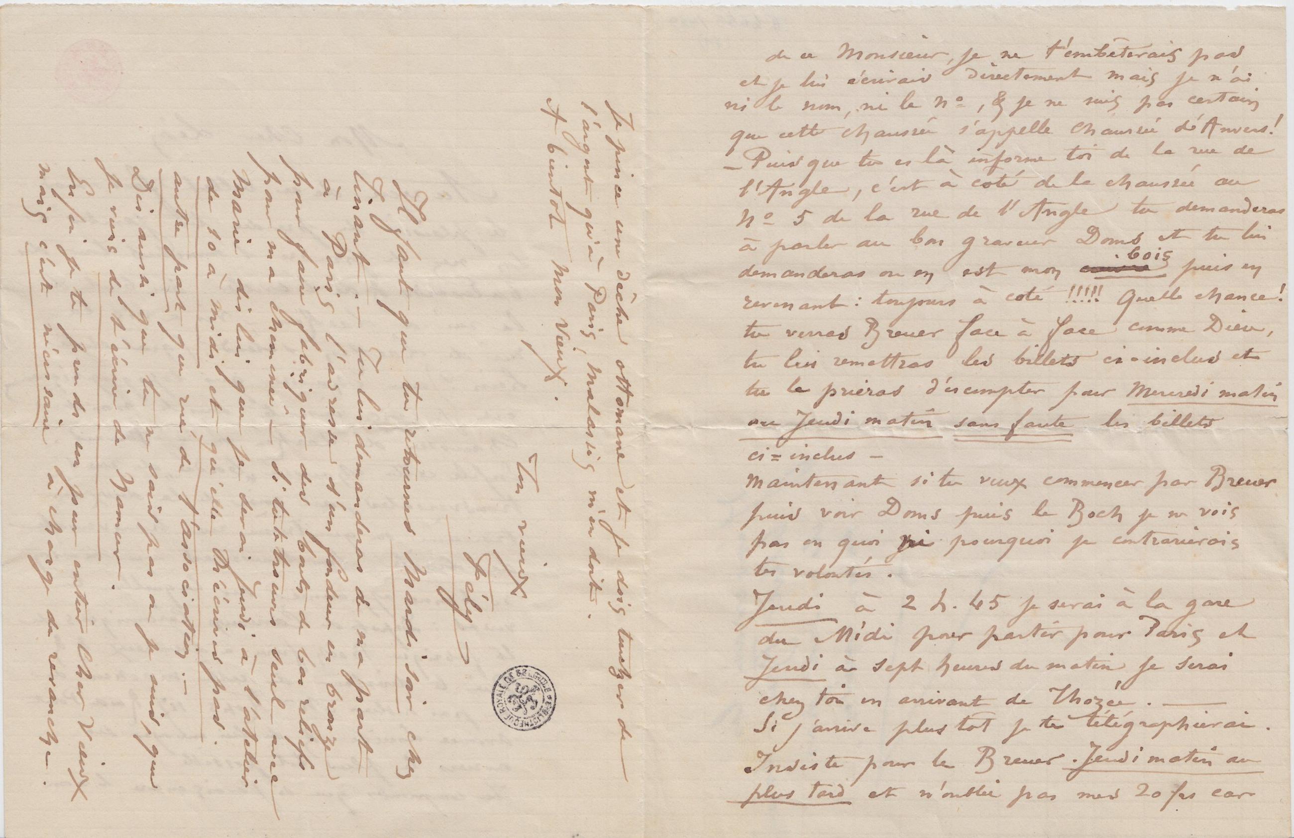 – Puisque tu es là informe toi de la rue de l’Angle, c’est à côté de la chaussée au n° 5 de la rue de l’Angle tu demanderas à parler au bon graveur Doms et tu lui demanderas où en est mon cuivre bois puis en revenant : toujours à côté !!!!! Quelle chance ! tu verras Breuer face à face comme Dieu, tu lui remettras les billets ci-inclus et tu le prieras d’escompter pour Mercredi matin ou Jeudi matin sans faute les billets ci-inclus –