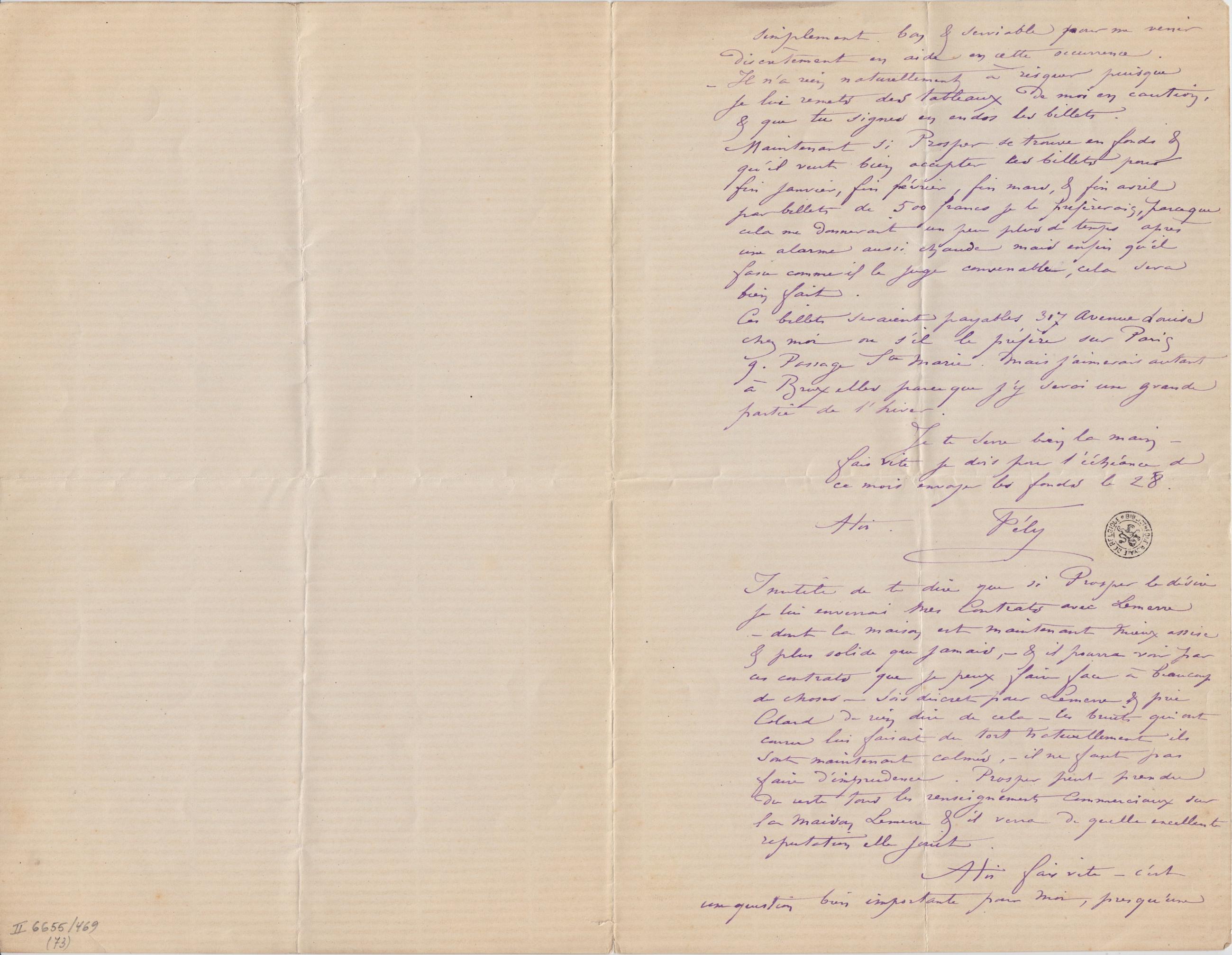 Inutile de te dire que si Prosper le désire je lui enverrai mes Contrats avec Lemerre – dont la maison est maintenant mieux assise & plus solide que jamais, – & il pourra voir par ces contrats que je peux faire face à beaucoup de choses – Sois discret pour Lemerre & prie Colard de rien dire de cela – les bruits qui ont couru lui faisait du tort naturellement ils sont maintenant calmés, – il ne faut pas faire d’imprudences. Prosper peut prendre du reste tous les renseignements commerciaux sur la maison Lemerre & il verra de quelle excellente réputation elle jouit.