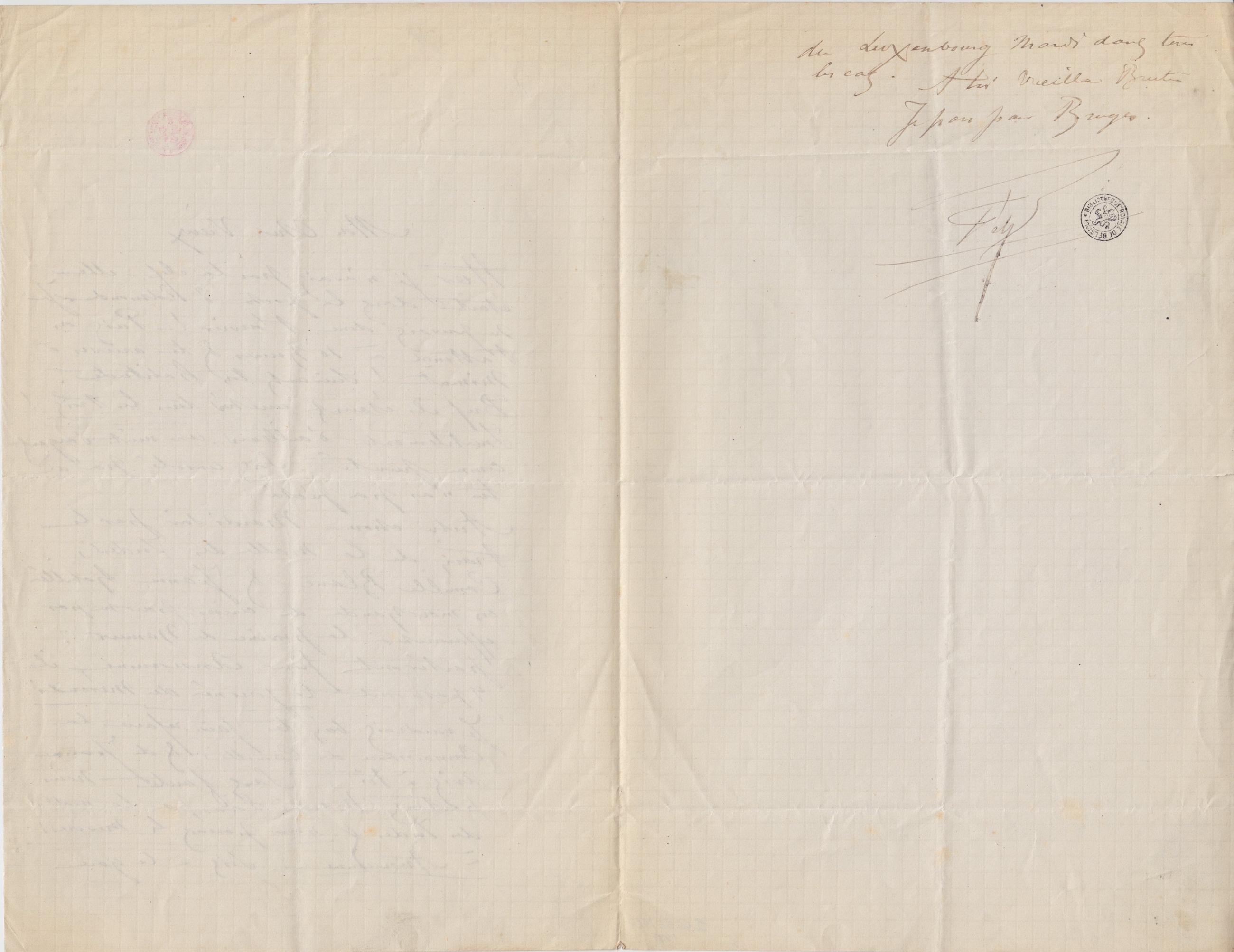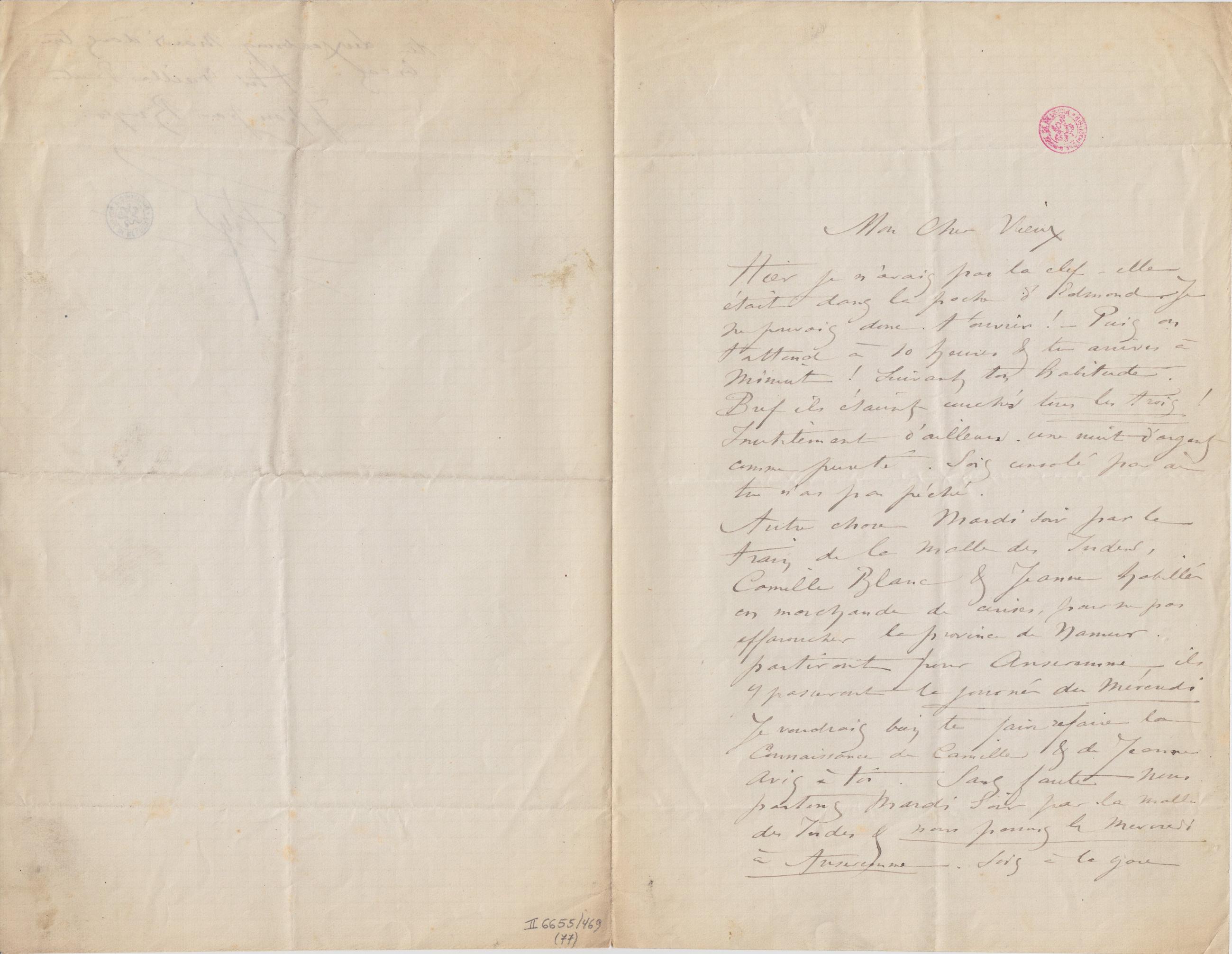 Autre chose Mardi soir par le train de la malle des Indes, Camille Blanc & Jeanne habillé en marchande de cerises, pour ne pas effaroucher la province de Namur partiront pour Anseremme, ils y passeront la journée du Mercredi Je voudrais bien de faire refaire la connaissance de Camille & de Jeanne. Avis à toi. Sans faute nous partons Mardi Soir par la malle des Indes & nous passons le Mercredi à Anseremme. – Sois à la gare