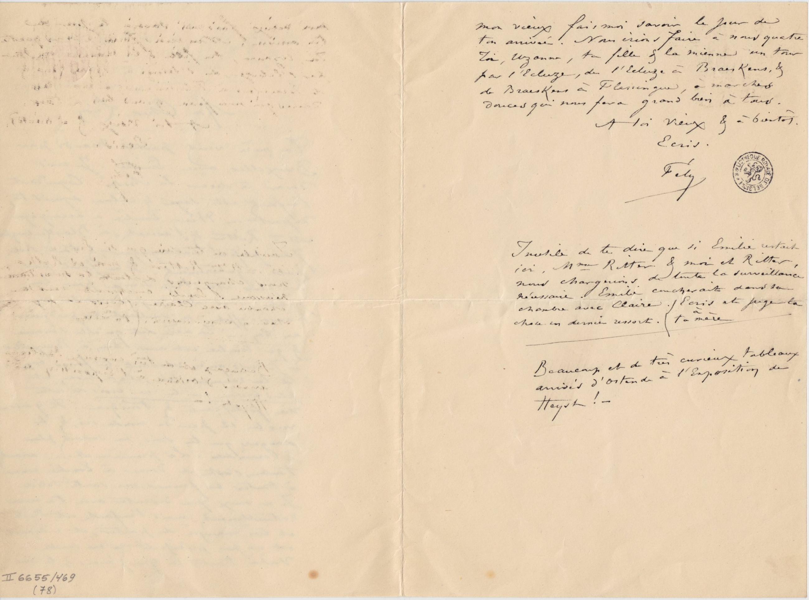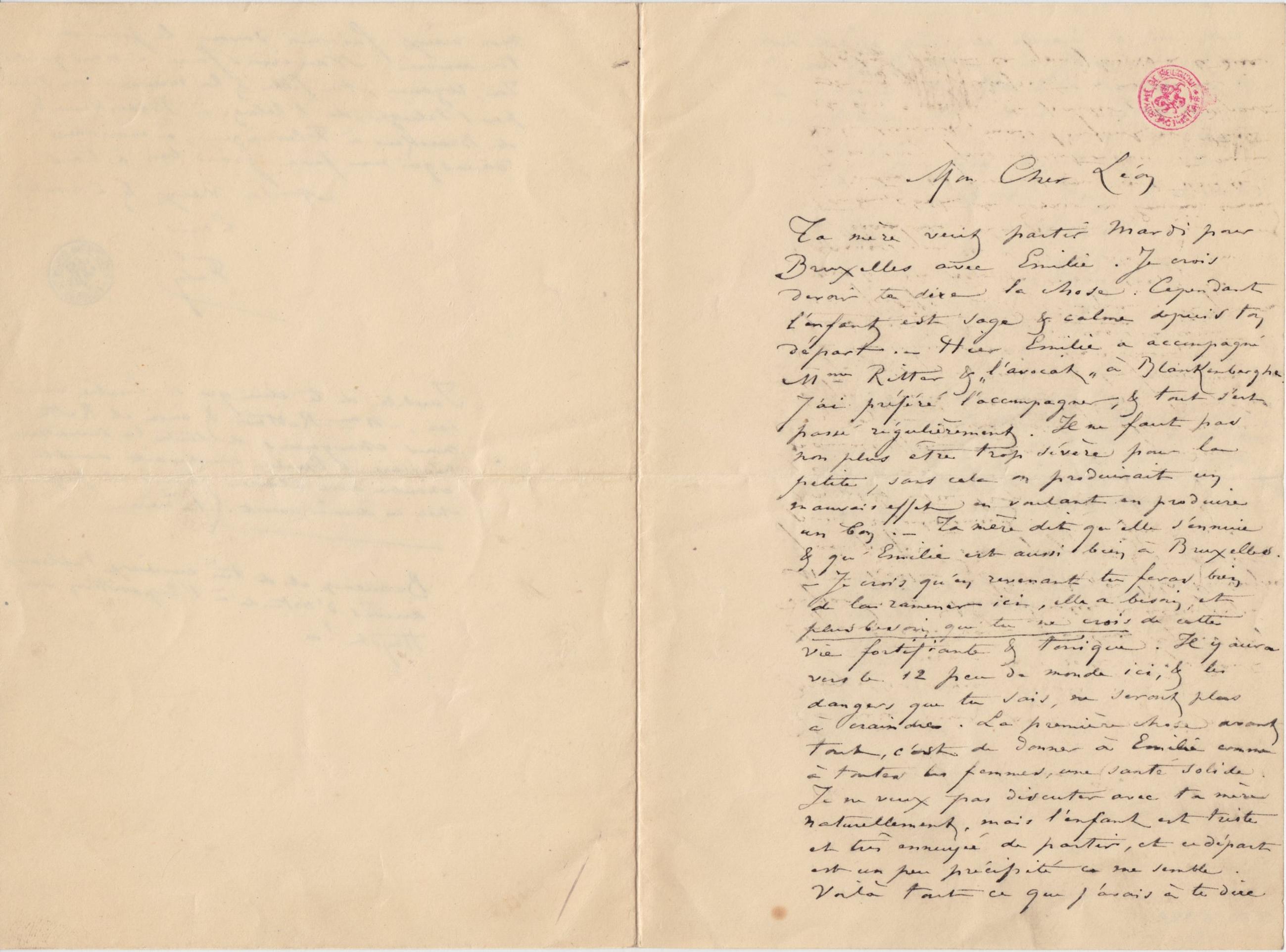 Ta mère veut partir Mardi pour Bruxelles avec Émilie. Je crois devoir te dire la chose. Cependant l’enfant est sage & calme depuis ton départ. – Hier Émilie a accompagné Mme Ritter & « l’avocat » à Blankenberghe. J’ai préféré l’accompagner, & tout s’est passé régulièrement. Il ne faut pas non plus être trop sévère pour la petite, sans cela on produirait un mauvais effet en voulant en produire un bon. – Ta mère dit qu’elle s’ennuie & qu’Émilie est aussi bien à Bruxelles. – Je crois qu’en revenant tu feras bien de la ramener ici, elle a besoin et plus besoin que tu ne crois de cette vie fortifiante & tonique. Il y aura vers le 12 peu de monde ici, & les dangers que tu sais, ne seront plus à craindre. La première chose avant tout, c’est de donner à Émilie comme à toutes les femmes, une santé solide. Je ne veux pas discuter avec ta mère naturellement, mais l’enfant est triste et très ennuyée de partir, et ce départ est un peu précipité ce me semble.