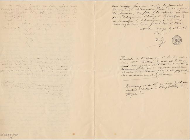 Mon Vieux fais moi savoir le jour de ton arrivée. Nous irions faire à nous quatre Toi, Uzanne, ta fille & la mienne un tour par l’Écluze, de l’Écluze à Braeskens, & de Braeskens à Flessingue, à marches douces qui nous fera grand bien à tous.