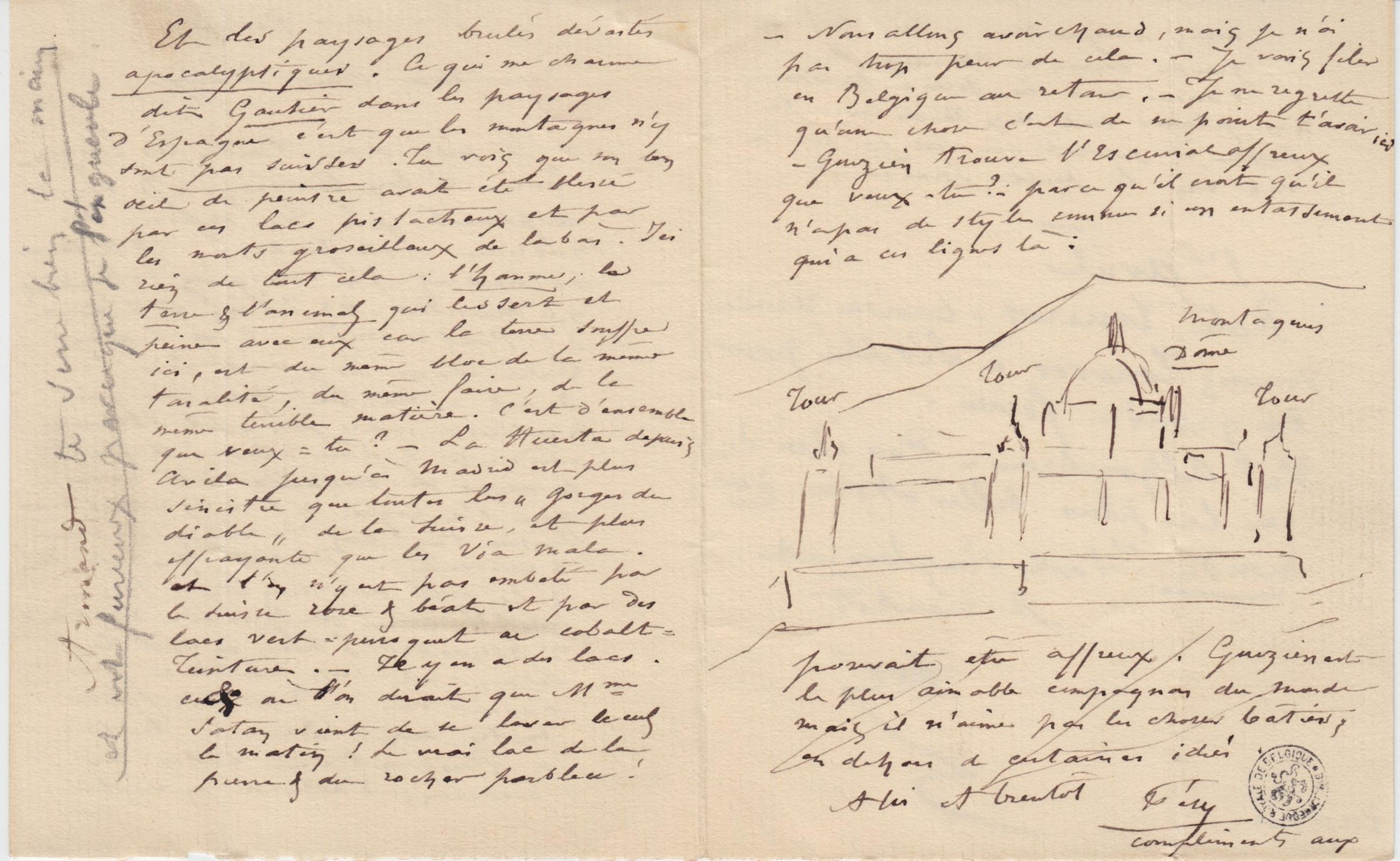 Et des paysages brulés dévastés apocalyptiques. Ce qui me charme dit Gautier dans les paysages d’Espagne c’est que les montagnes n’y sont pas suisses. Tu vois que son bon œil de peintre avait été blessé par ces lacs pistacheux et par les monts groseilleux de la bàs. Ici rien de tout cela : l’homme ; la terre & l’animal qui les sert et peine avec eux car la terre souffre ici, est du même bloc de la même tonalité, du même faire, de la même terrible matière. C’est d’ensemble que veux-tu ? – La Huerta depuis Avila jusqu’à Madrid est plus sinistre que toutes les « Gorges du diable » de la Suisse, et plus effrayante que les Via Mala. et l’on n’y est pas embêté par le suisse rose & béat et par des lacs vert-perroquet ou cobalt-Teinture. – Il y en a des lacs. & où l’on dirait que Mme Satan vient de se laver le cul le matin ! Le vrai lac de la pierre & du rocher parbleu !