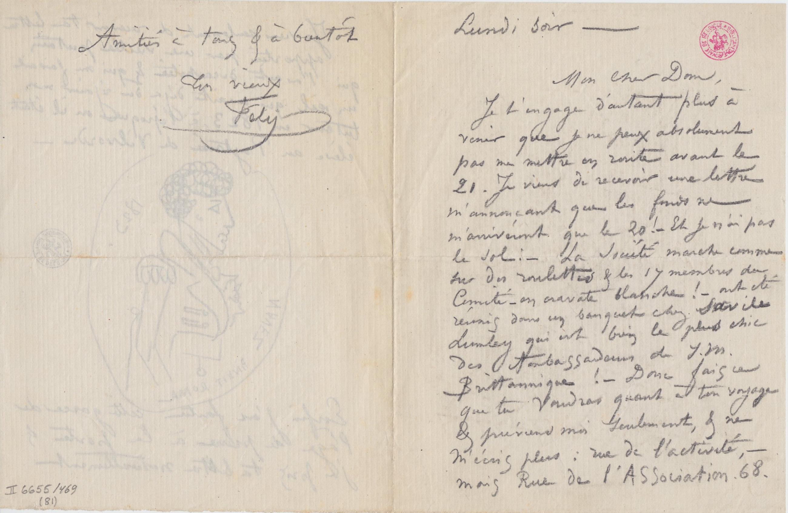 Je t’engage d’autant plus à venir que je ne peux absolument pas me mettre en route avant le 21. Je viens de recevoir une lettre m’annonçant que les fonds ne m’arriveront que le 20 ! – Et je n’ai pas le sol : – La Société marche comme sur des roulettes & les 17 membres du Comité – en cravate blanche ! – ont été réunis dans un banquet chez Savile Lemley qui est bien le plus chic des Ambassadeurs de S. M. Brittannique ! – Donc fais ce que tu voudras quant à ton voyage & préviens moi seulement, & ne m’écris plus : rue de l’activité, – mais Rue de l’ASSociation. 68.