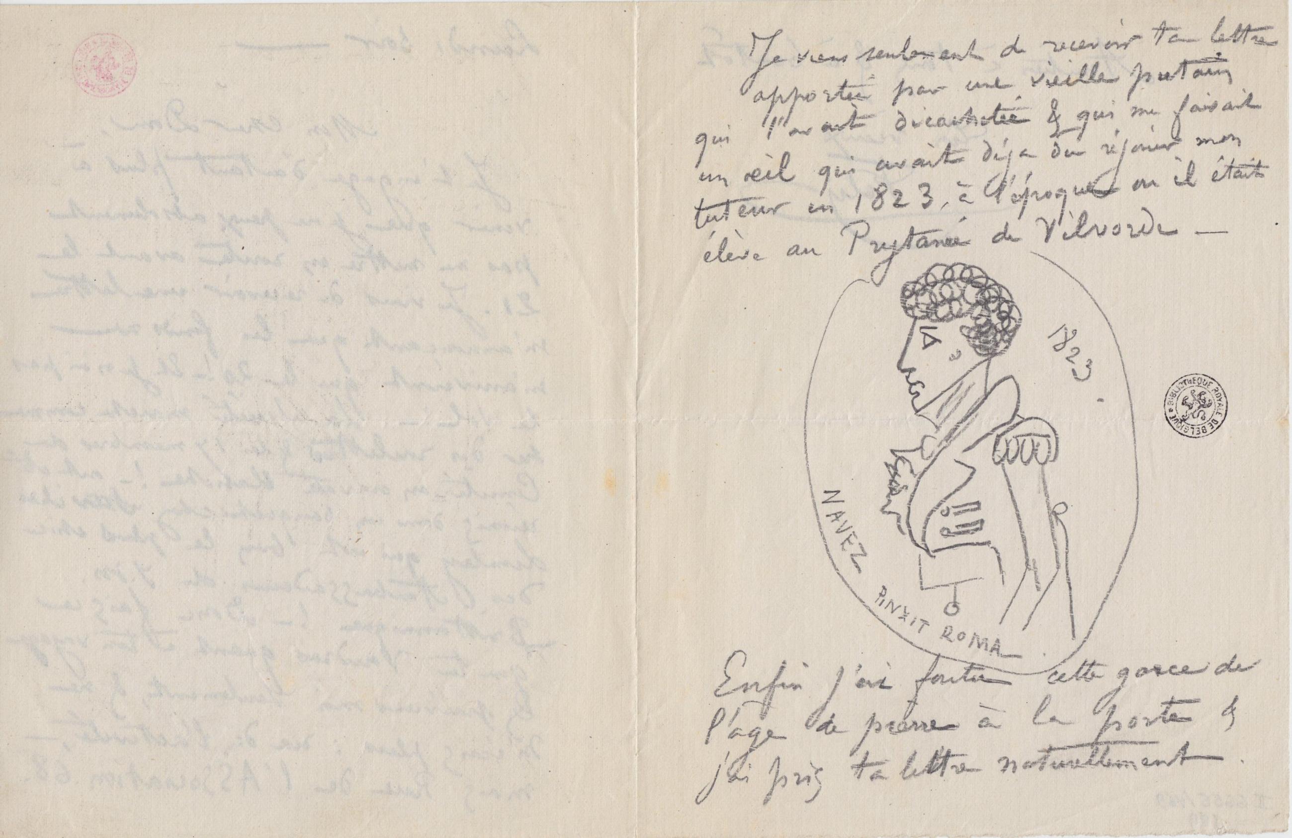 Je viens seulement de recevoir ta lettre apportée par une vieille putain qui l’avait décachetée & qui me faisait un œil qui avait déja du réjouir mon tuteur en 1823, à l’époque où il était élève au Prytanée de Vilvorde –