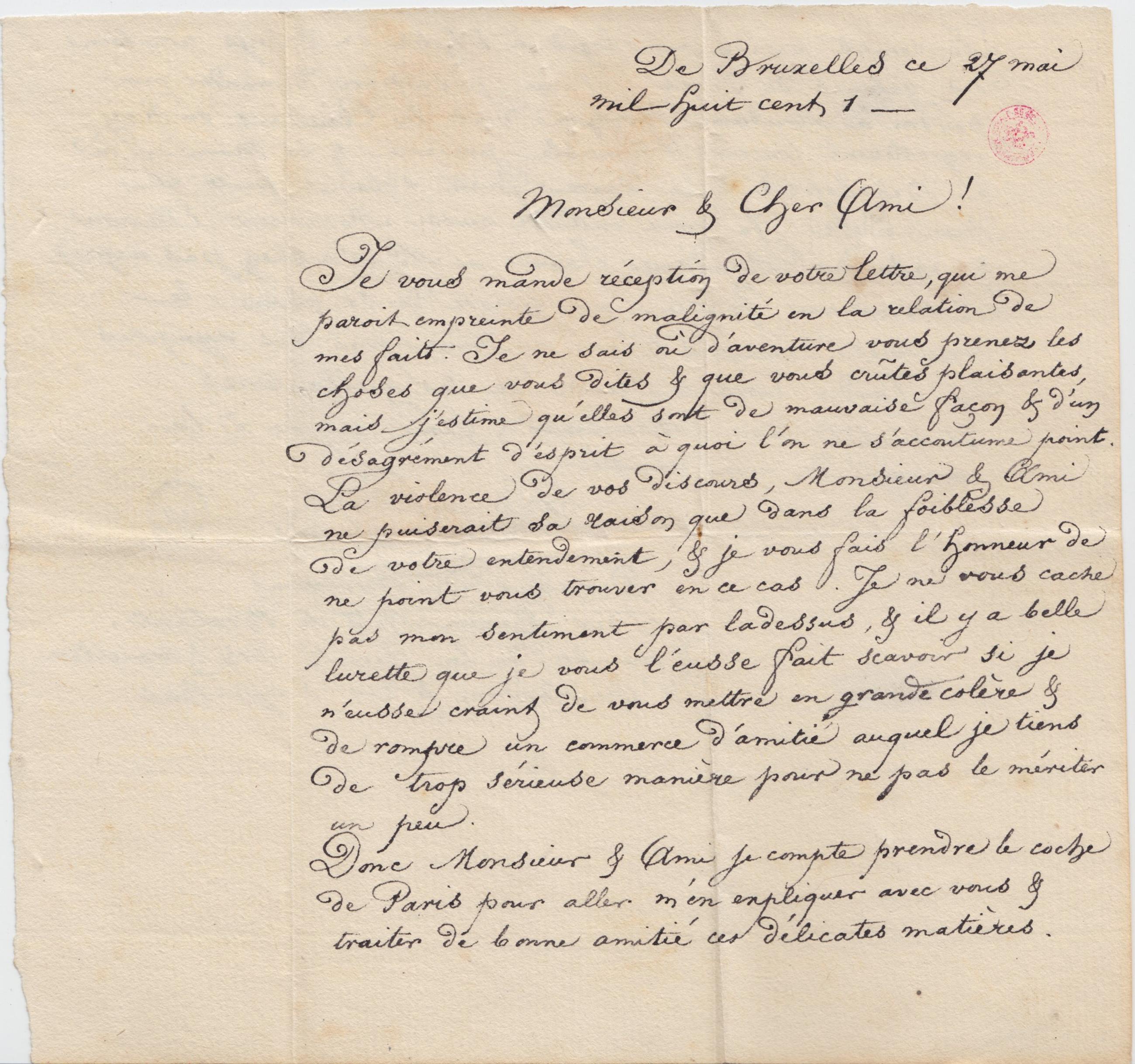 Donc Monsieur & Ami, je compte prendre le coche de Paris pour aller m’en expliquer avec vous & traiter de bonne amitié ces délicates matières.