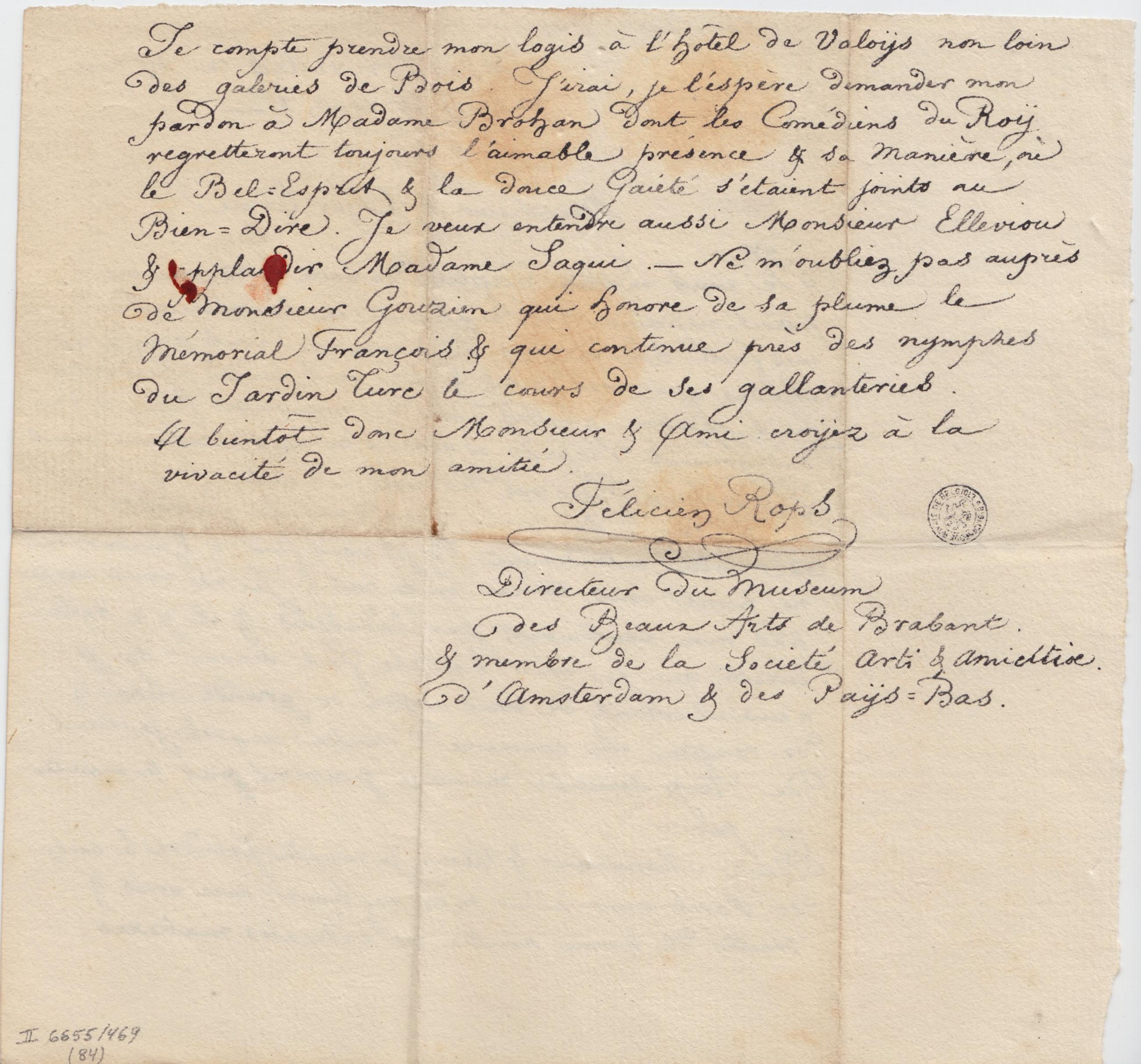 Je compte prendre mon logis à l’hôtel de Valoÿs non loin des galeries de Bois. J’irai, je l’espère demander mon pardon à Madame Brohan dont les Comédiens du Roÿ regretteront toujours l’aimable présence & sa manière, où le Bel-Esprit & la douce Gaieté s’étaient joints au Bien-Dire. Je veux entendre aussi Monsieur Elleviou & applaudir Madame Saqui. – Ne m’oubliez pas auprès de Monsieur Gouzien qui honore de sa plume le Mémorial François & qui continue près des nymphes du Jardin Turc le cours de ses gallanteries.