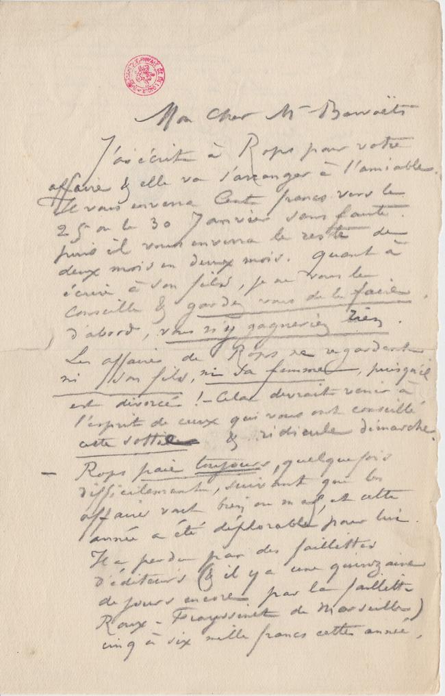 – Ropspaie toujours, quelque fois difficilement, suivant que les affaires vont bien ou mal, et cette année a été déplorable pour lui. Il a perdu par des faillittes d’éditeurs (& il y a une quinzaine de jours encore par la faillitteRoux-Frayssinet de Marseille) cinq à six mille francs cette année,