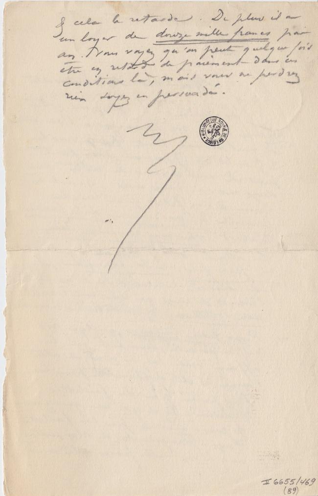 & cela le retarde. De plus il a un loyer de douze mille francs par an. Vous voyez qu’on peut quelque fois être en retard de paiement dans ces conditions là, mais vous ne perdrez rien soyez en persuadé.