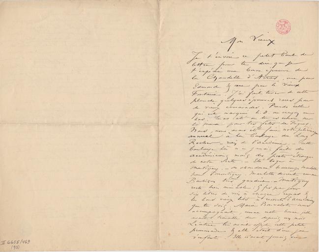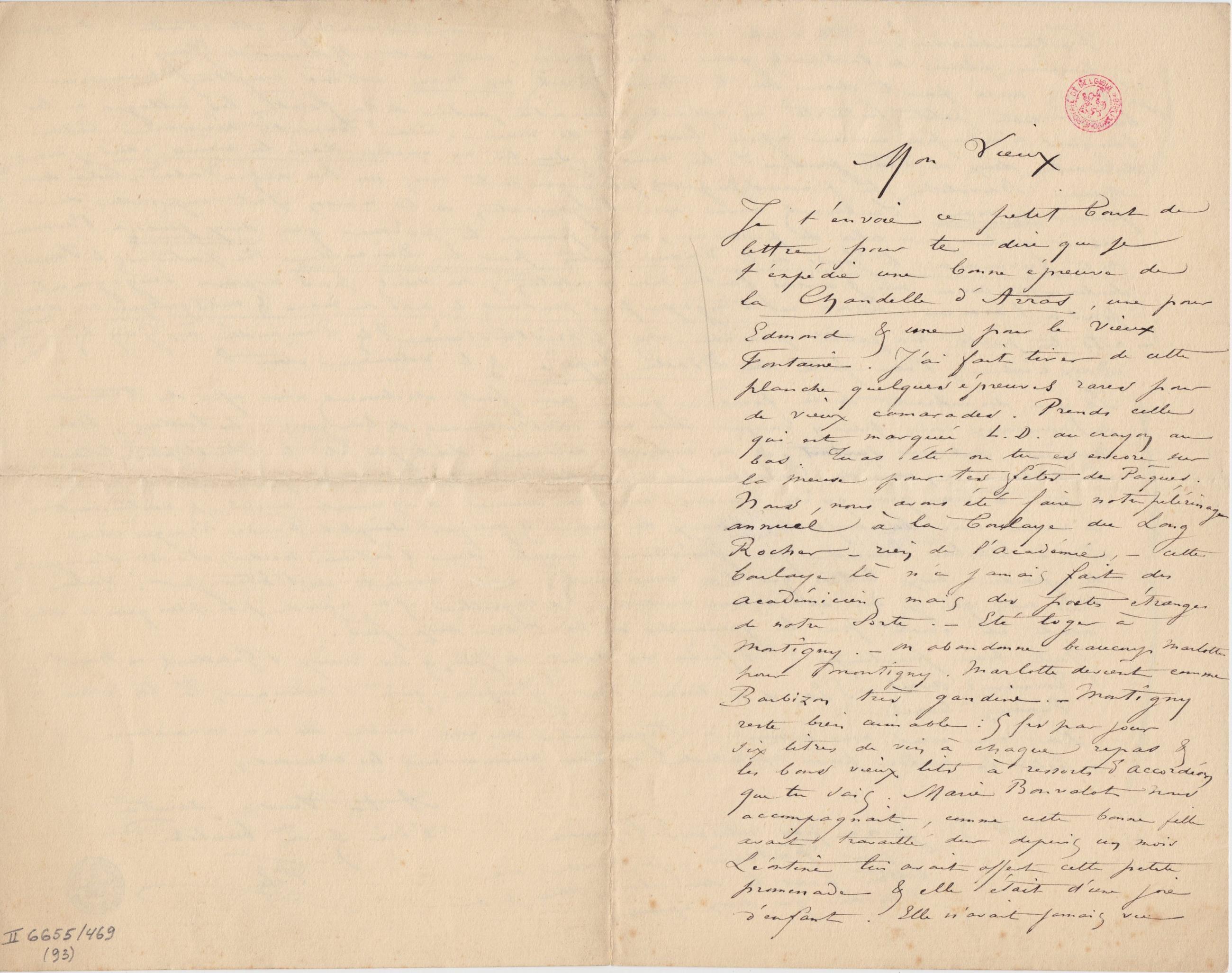 Je t’envoie ce petit bout de lettre pour te dire que je t’expédie une bonne épreuve de la Chandelle d’Arras, une pour Edmond & une pour le vieux Fontaine. J’ai fait tirer de cette planche quelques épreuves rares pour de vieux camarades. Prends celle qui est marquée L.D. au crayon au bas. Tu as été ou tu es encore sur la Meuse pour tes fêtes de Pâques. Nous, nous avons été faire notre pèlerinage annuel à la Coulaye du Long Rocher – rien de l’académie, – cette boulaye là n’a jamais fait des académiciens mais des poètes étranges de notre sorte. – Été loger à Montigny. – On abandonne beaucoup Marlotte pour Montigny. Marlotte devient comme Barbizon très gandine. – Montigny reste bien aimable : 5 frs par jour six litres de vin à chaque repas & les bons vieux lits à ressorts d’accordéon que tu sais. Marie Bonvalot nous accompagnait, comme cette bonne fille avait travaillé dur depuis un mois Léontine lui avait offert cette petite promenade & elle était d’une joie d’enfant. Elle n’avait jamais vu