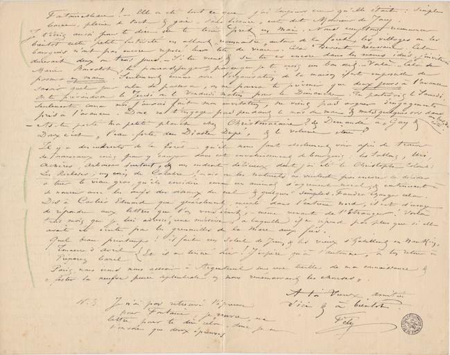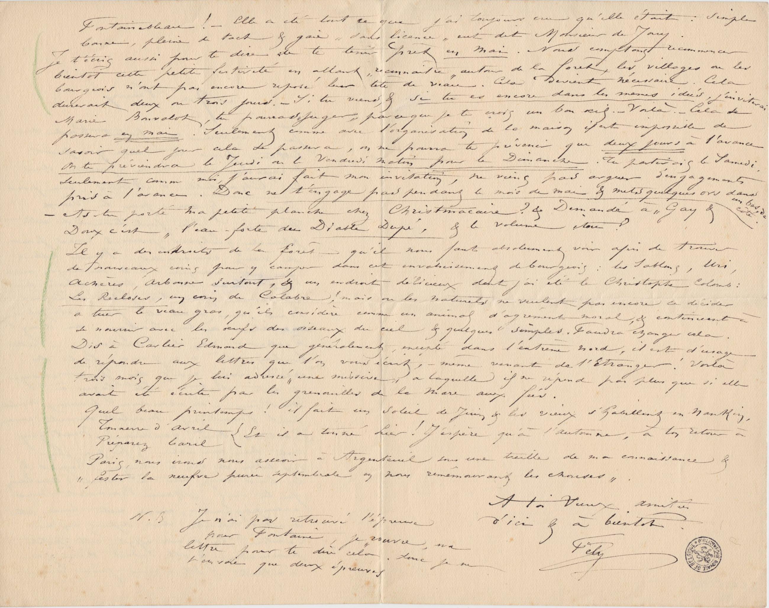 Je t’écris aussi pour te dire de te tenir prêt en Mai. Nous comptons recommencer bientôt cette petite festivité en allant « reconnaître » autour de la forêt, les villages où les bourgeois n’ont pas encore reposé leur tête de veau. Cela devient nécessaire. Cela durerait deux ou trois jours. – Si tu viens, & si tu es encore dans les mêmes idées, j’inviterai Marie Bonvalot, tu pourras « juger » parce que je te crois un bon œil. – Voilà. – Cela se passera en Mai. Seulement comme avec l’organisation de la maison il est impossible de savoir quel jour cela se passera, on ne pourra te prévenir que deux jours à l’avance On te préviendra le Jeudi ou le Vendredi matin pour le Dimanche. Tu partirais le Samedi. Seulement comme moi, j’aurai fait mon invitation, ne viens pas arguer d’engagements pris à l’avance. Donc ne t’engage pas pendant le mois de Mai & mets quelques ors dans un bas de côté.