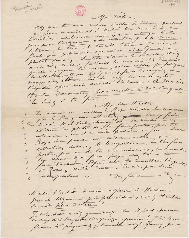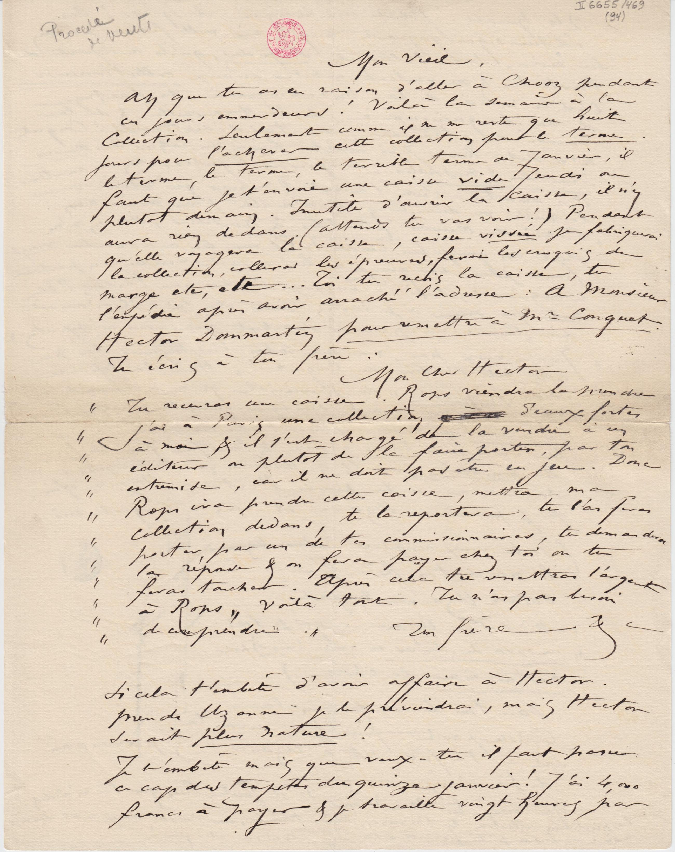 Ah que tu as raison d’aller à Chooz pendant ces jours emmerdeurs ! Voilà la semaine à la Collection. Seulement il ne me reste que huit jours pour l’achever cette collection pour le terme, le terme, le terme, le terrible terme de Janvier, il faut que je t’envoie une caisse vide Jeudi ou plutôt demain. Inutile d’ouvrir la caisse, il n’y aura rien dedans. (attends tu vas voir !) Pendant qu’elle voyagera la caisse, caisse vissée, je fabriquerai la collection, collerai les épreuves, ferai les croquis de marge etc, etc… Toi tu reçois la caisse, tu l’expédie après avoir arraché l’adresse : À Monsieur Hector Dommartinpour remettre à Mr Conquet. Tu écris à ton frère :