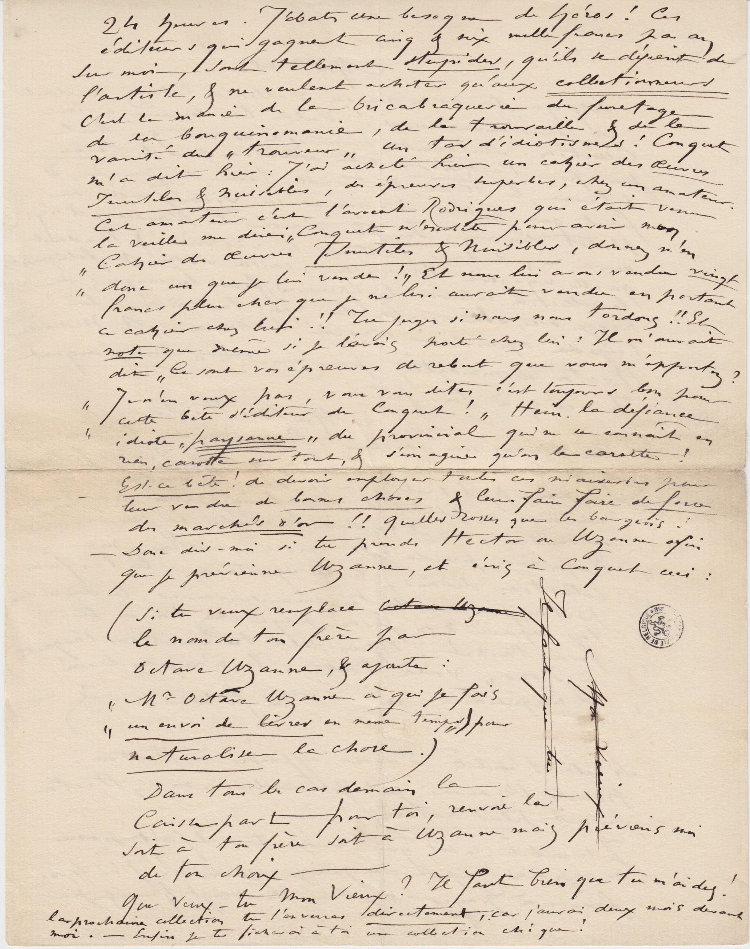 (Si tu veux remplace Octave Uzanne le nom de ton frère par Octave Uzanne, & ajoute : « MrOctave Uzanne à qui je fais un envoi de livres en même temps ») pour naturaliser la chose.)
