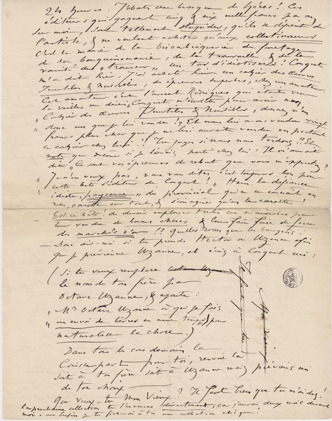 24 heures. J’abats une besogne de héros ! Ces éditeurs qui gagnent cinq & six mille francs par an sur moi, sont tellement stupides, qu’ils se défient de l’artiste, & ne veulent acheter qu’aux collectionneurs. C’est la manie de la bricabraquerie du furetage de la bouquinomanie, de la trouvaille et de la vanité du « trouveur » un tas d’idiotismes ! Conquet m’a dit hier : J’ai acheté hier un cahier des Œuvres Inutiles & Nuisibles, des épreuves superbes, chez un amateur. Cet amateur c’est l’avocat Rodrigues qui était venu la veille me dire : « Conquet m’embête pour avoir mon Cahier des Oeuvres Inutiles & Nuisibles, donnez m’en donc un que je lui vende ! » Et nous lui avons vendu vingt francs plus cher que je ne lui aurait vendu en portant ce cahier chez lui !! Tu juges si nous nous tordons !! Et note que même si je l’avais porté chez lui : il m’aurait dit « Ce sont vos épreuves de rebut que vous m’apportez ? Je n’en veux pas, vous vous dites c’est toujours bon pour cette bête d’éditeur de Conquet ! » Hein. la défiance idiote « paysanne » du provincial qui ne se connaît en rien, carotte sur tout & s’imagine qu’on le carotte !